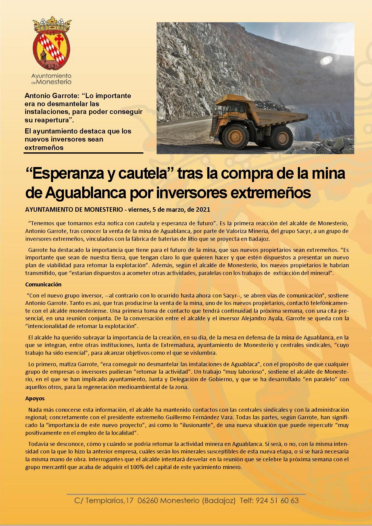 "Esperanza y cautela" tras la compra de la mina de Aguablanca por inversores extremeños