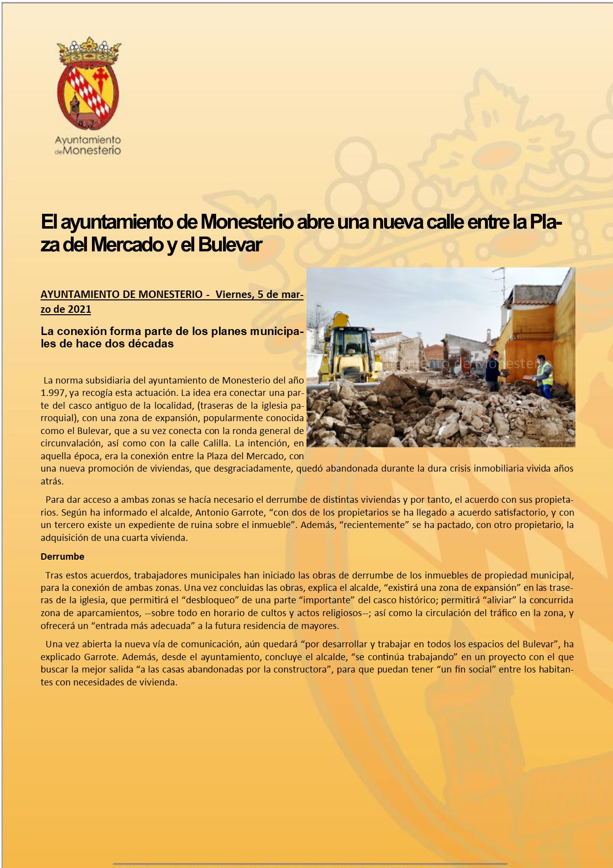 El ayuntamiento de Monesterio abre una nueva calle entre la Plaza del Mercado y el Bulevar