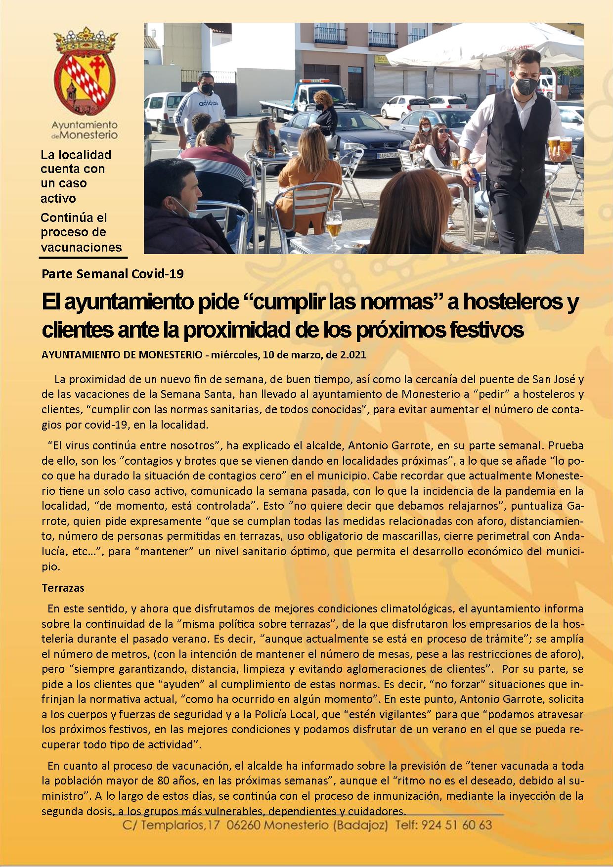 Parte semanal Covid-19: El ayuntamiento pide "cumplir las normas" a hosteleros y clientes ante la proximidad de los próximos festivos