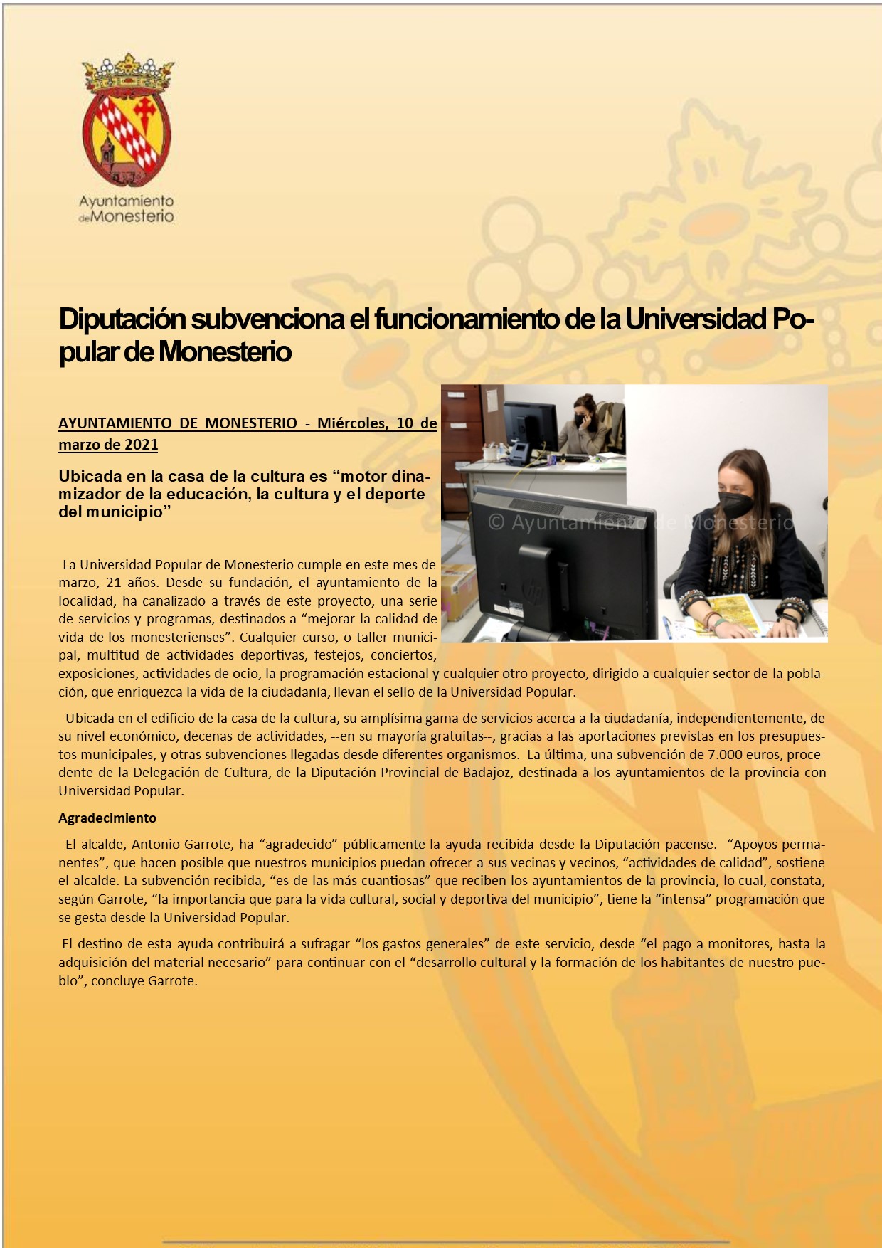 Diputación subvenciona el funcionamiento de la Universidad Popular de Monesterio