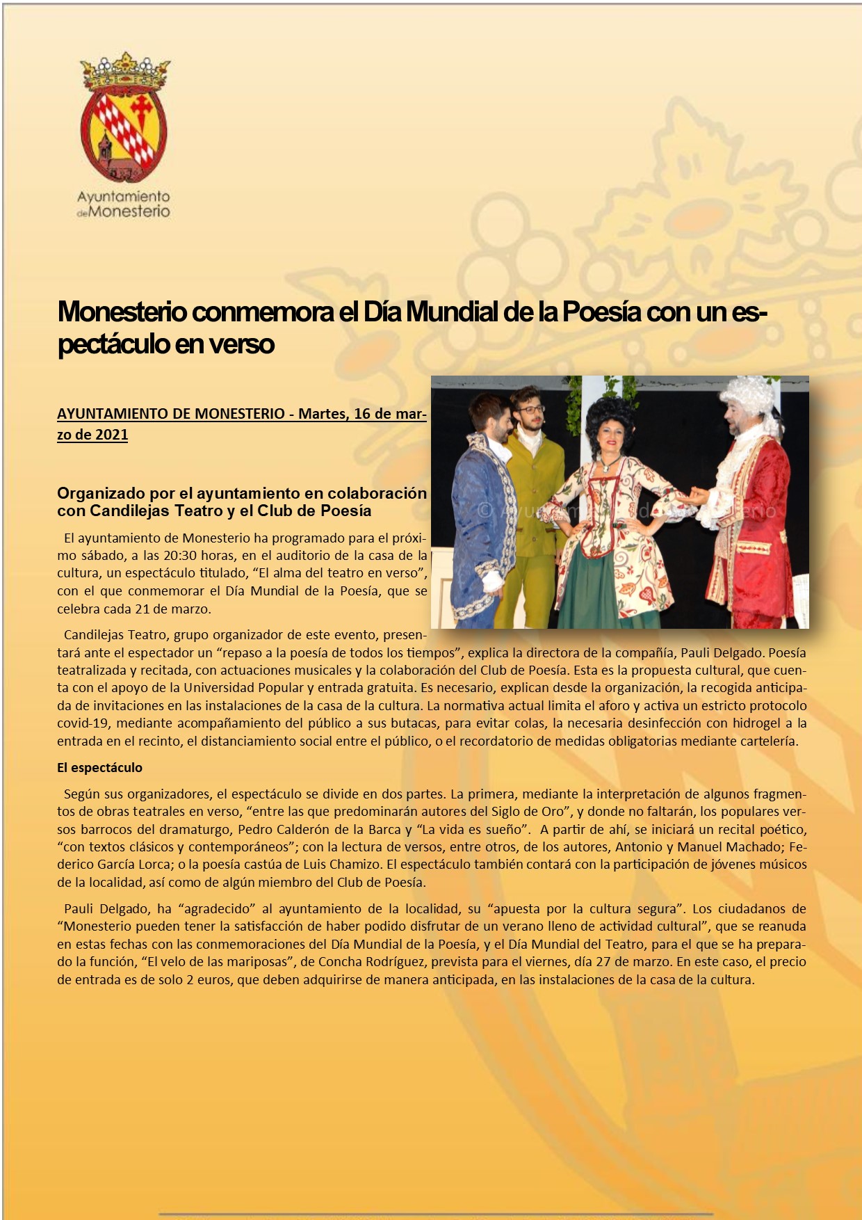 Monesterio conmemora el Día Mundial de la Poesía con un espectáculo en verso