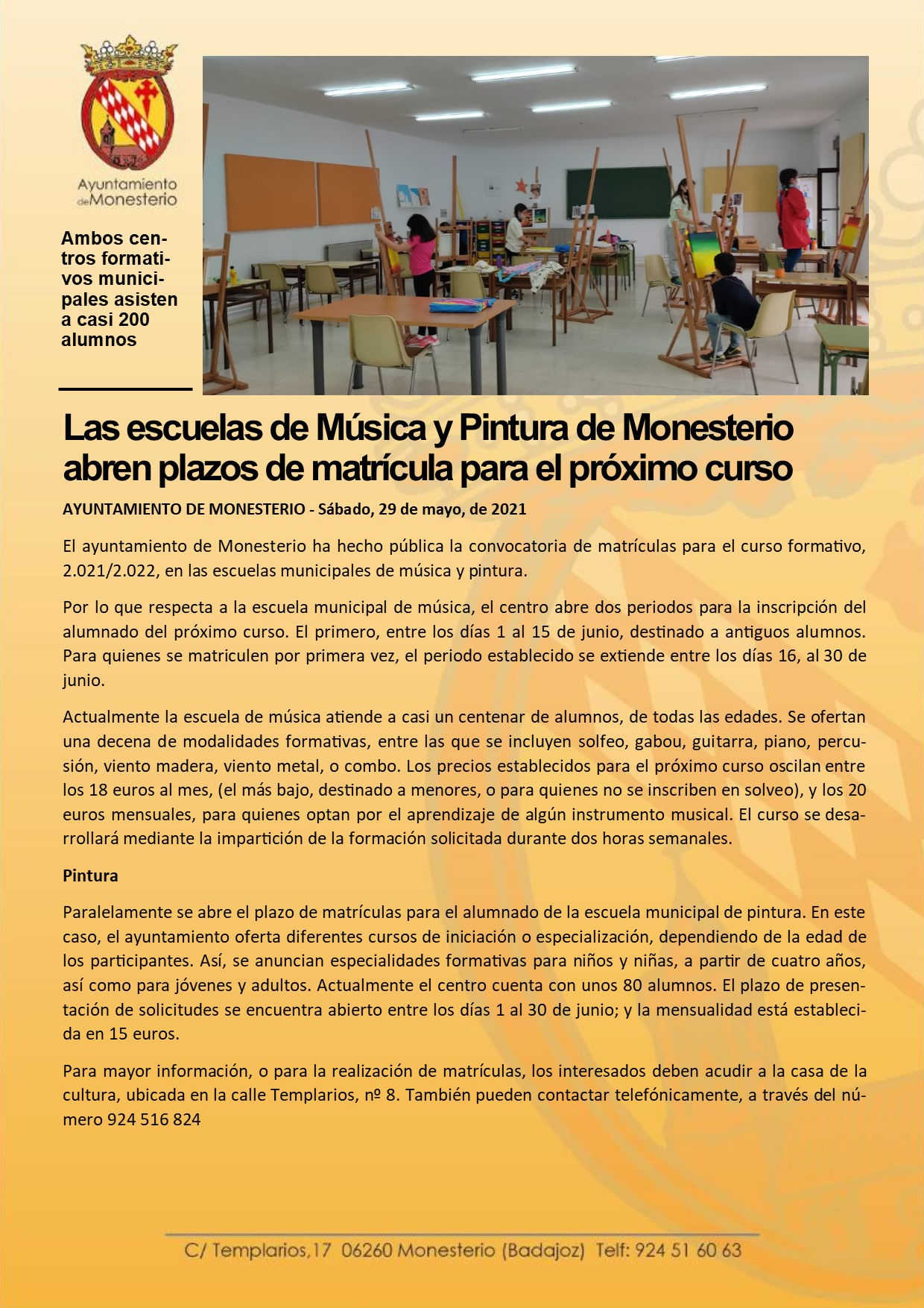 Las escuelas de Música y Pintura de Monesterio abren plazos de matrícula para el próximo curso