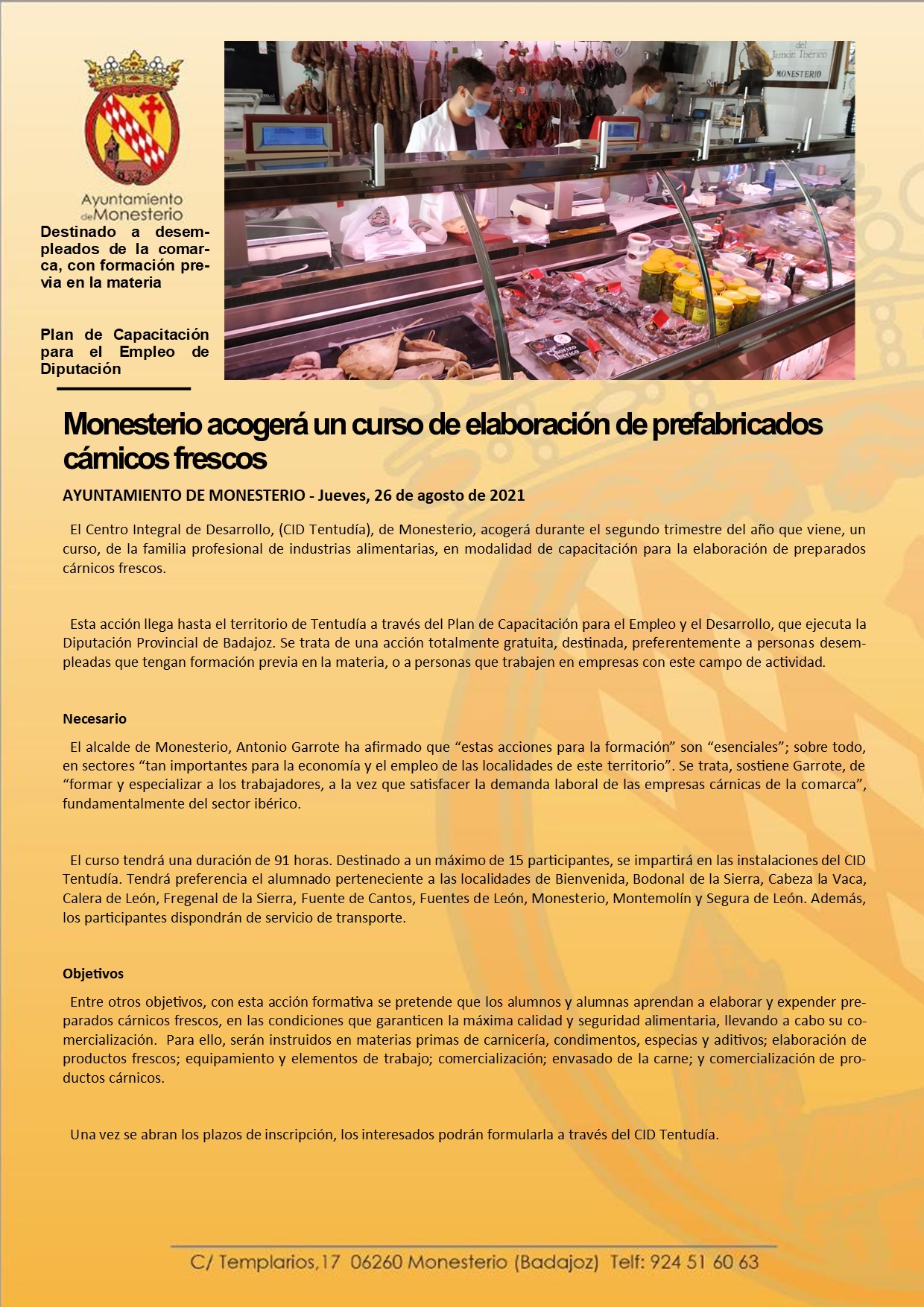 Monesterio acogerá un curso de elaboración de prefabricados cárnicos frescos