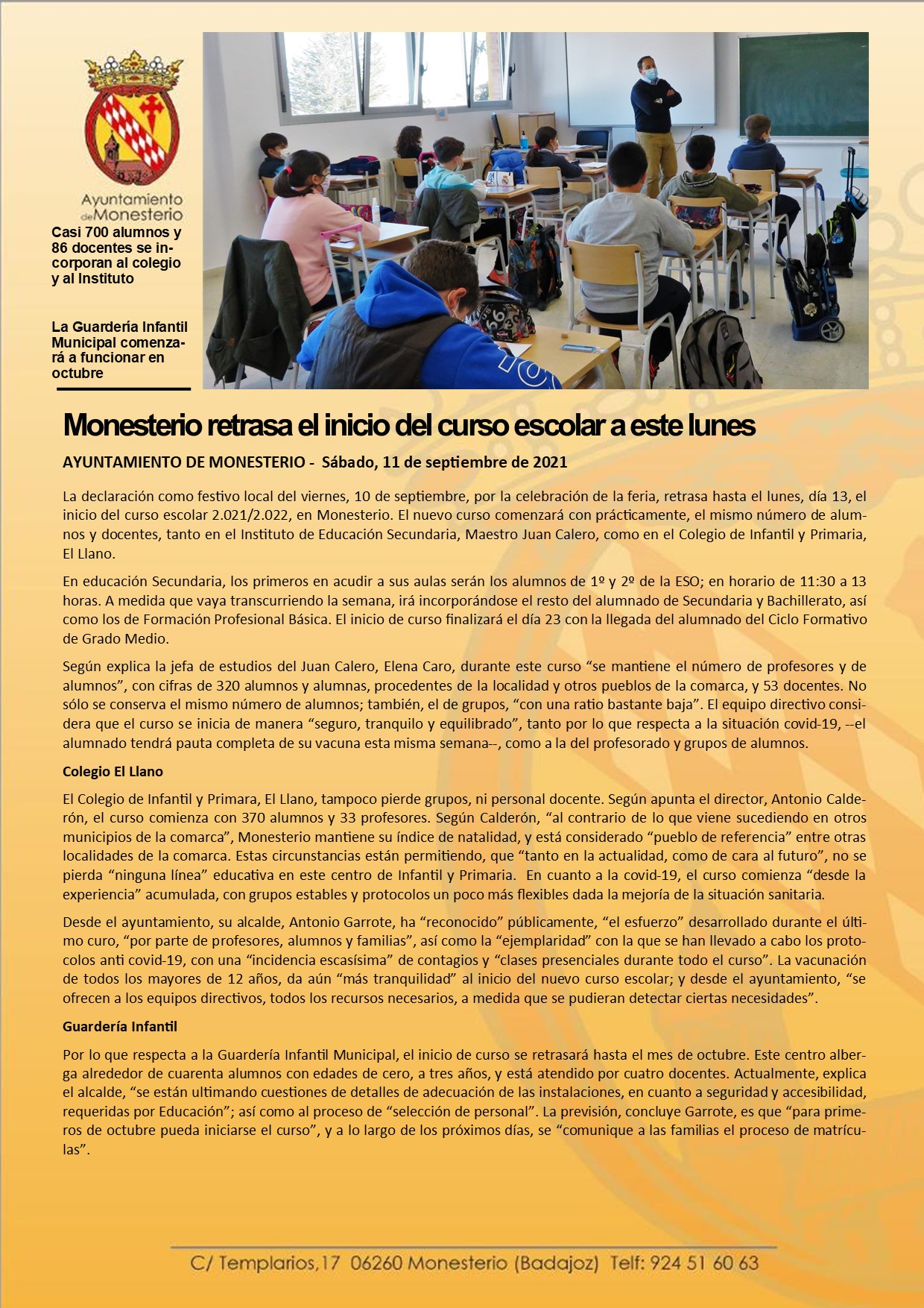 Monesterio retrasa el inicio del curso escolar a este lunes