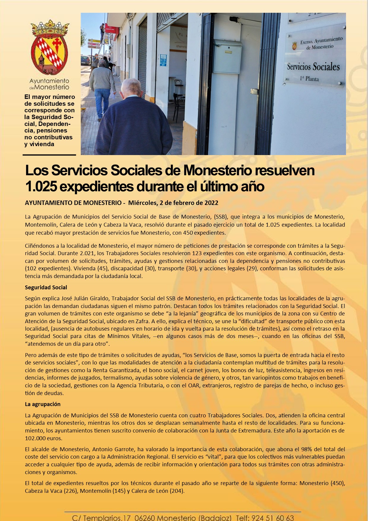 Los Servicios Sociales de Monesterio resuelven 1.025 expedientes durante el último año