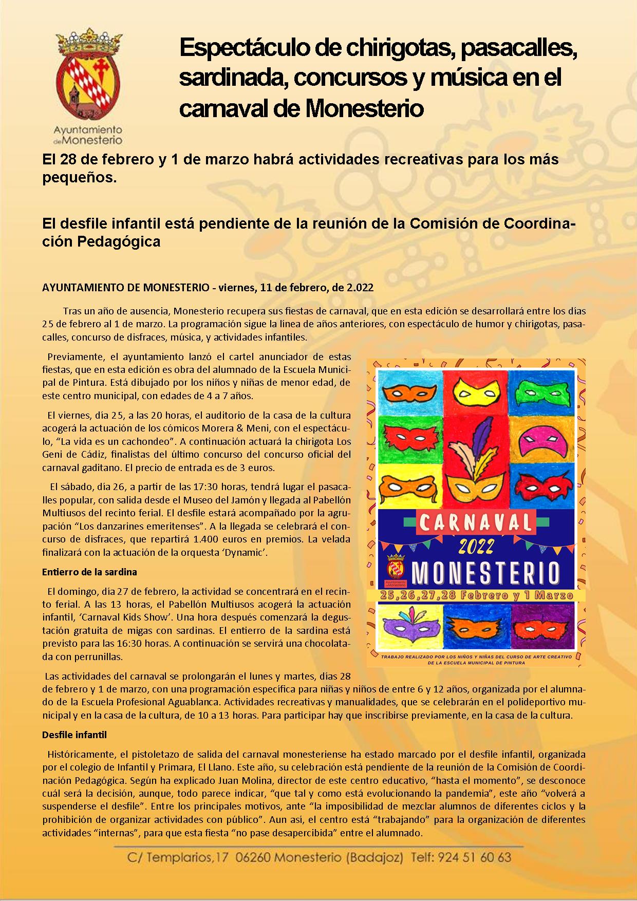 Espectáculo de chirigotas, pasacalles, sardinada, concursos y música en el carnaval de Monesterio