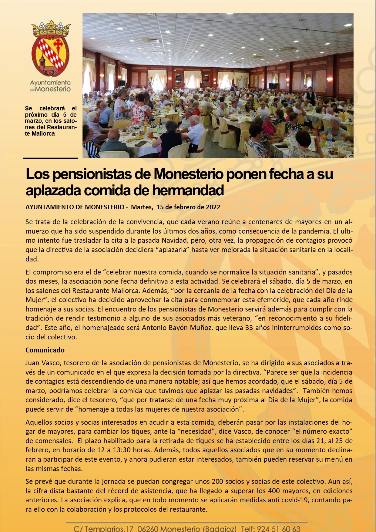 Los pensionistas de Monesterio ponen fecha a su aplazada comida de hermandad