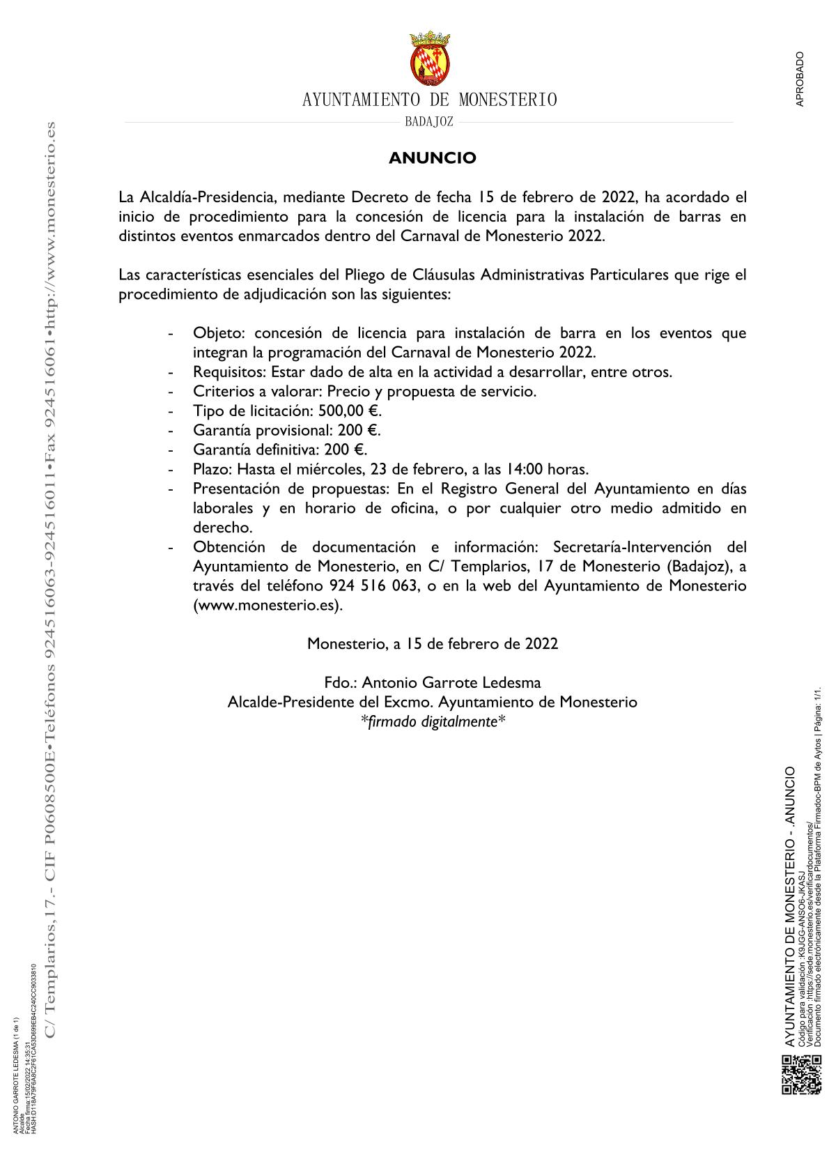 Anuncio de licitación para instalación de barras en distintos eventos enmarcados dentro del Carnaval de Monesterio 2022