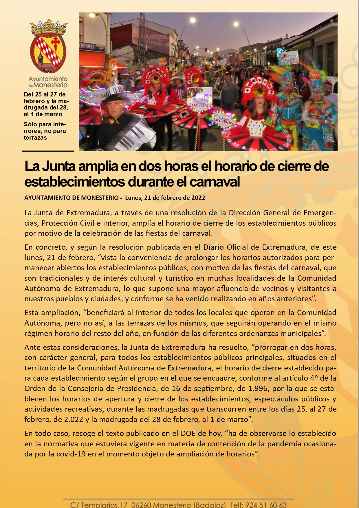 La Junta amplia en dos horas el horario de cierre de establecimientos durante el carnaval