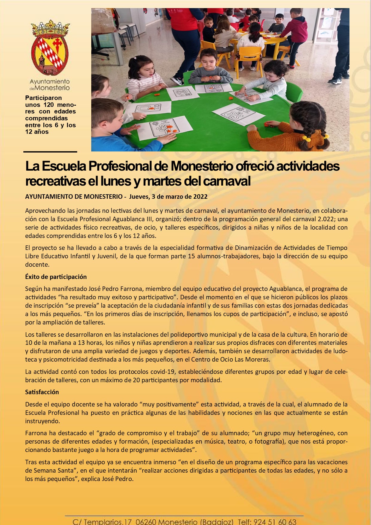 La Escuela Profesional de Monesterio ofreció actividades recreativas el lunes y martes del carnaval