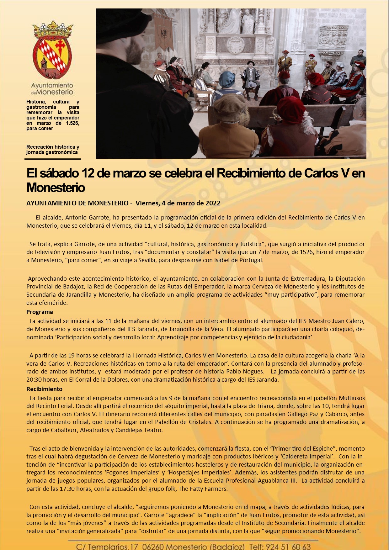 El sábado 12 de marzo se celebra el Recibimiento de Carlos V en Monesterio