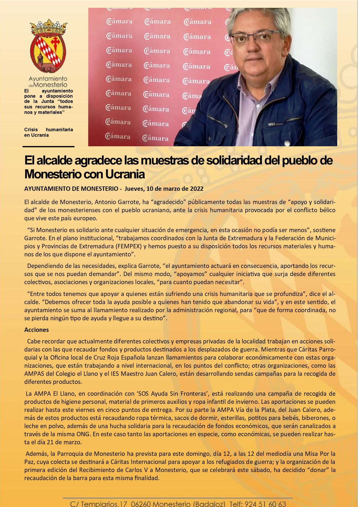 El alcalde agradece las muestras de solidaridad del pueblo de Monesterio con Ucrania