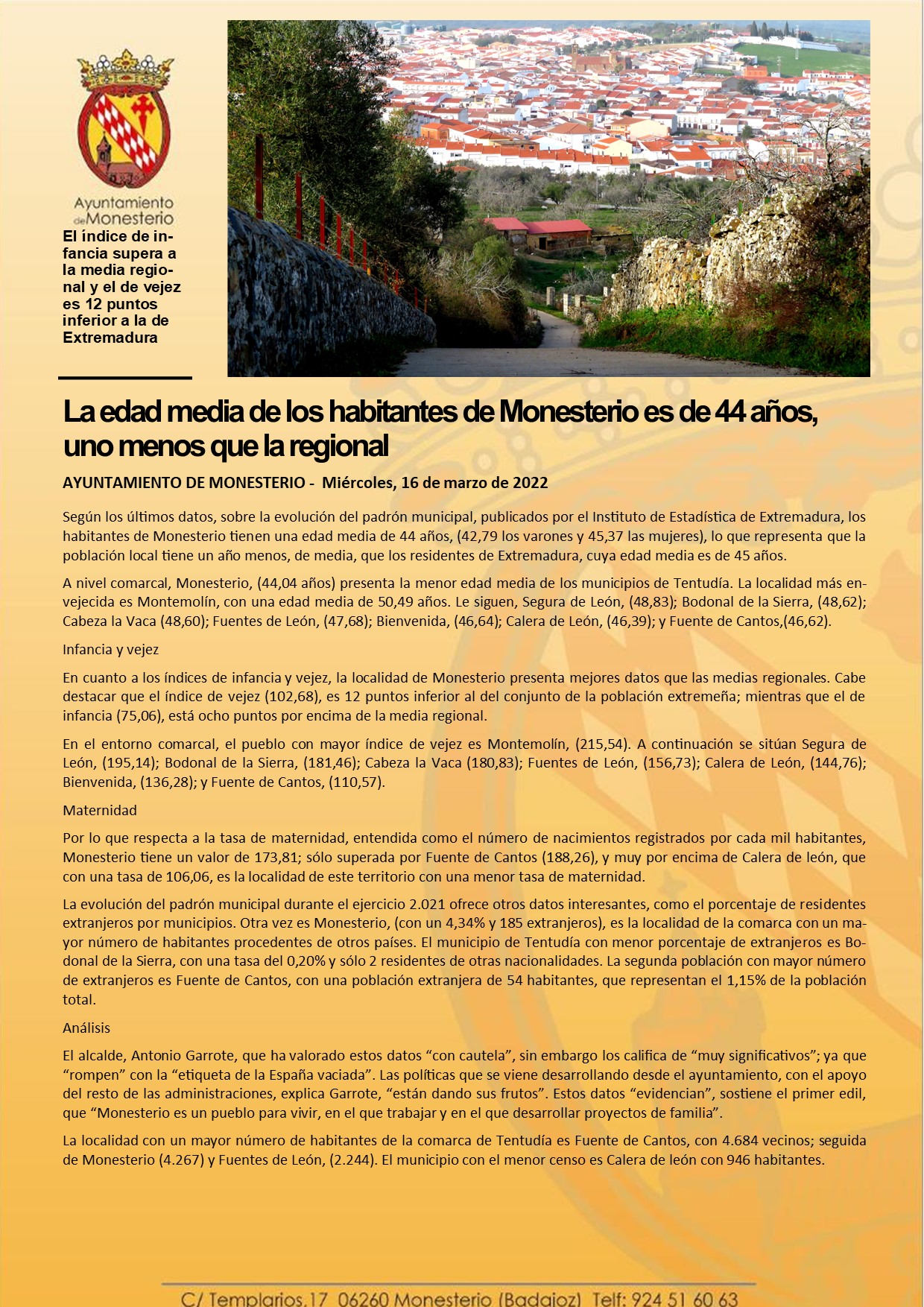 La edad media de los habitantes de Monesterio es de 44 años, uno menos que la regional