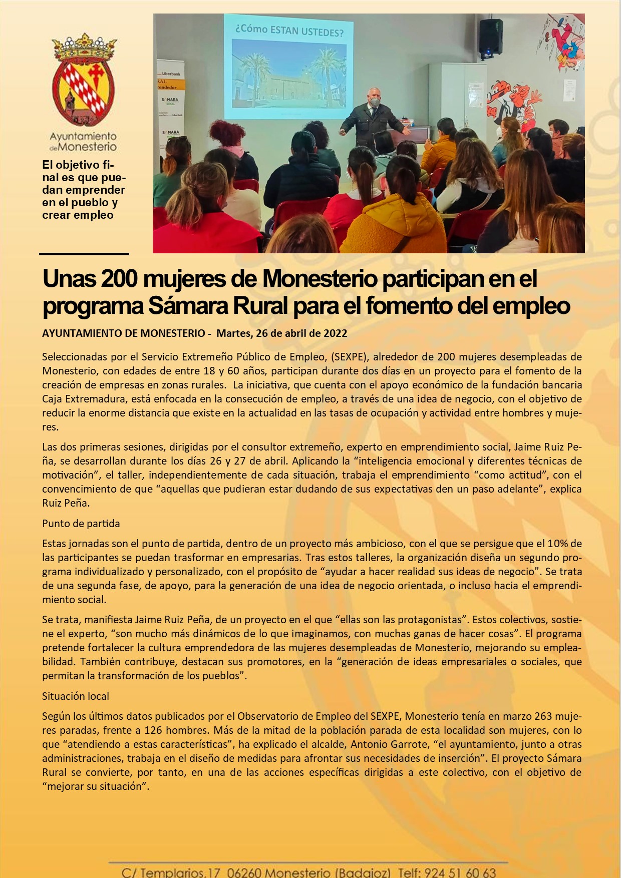 Unas 200 mujeres de Monesterio participan en el programa Sámara Rural para el fomento del empleo