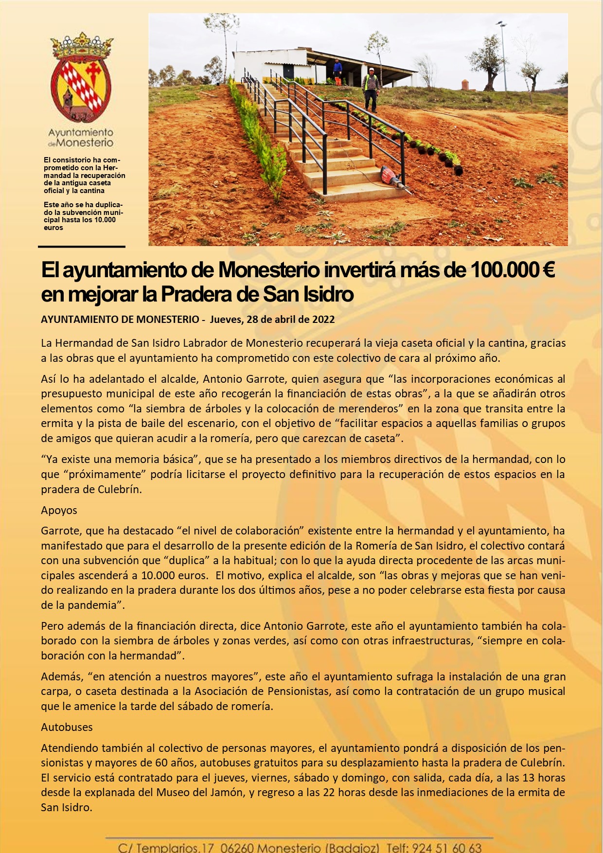 El ayuntamiento de Monesterio invertirá más de 100.000 € en mejorar la Pradera de San Isidro