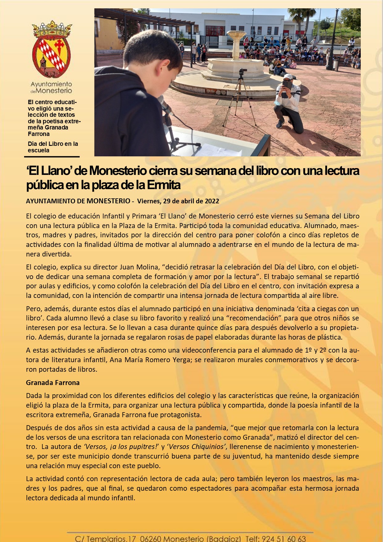 ‘El Llano’ de Monesterio cierra su semana del libro con una lectura pública en la plaza de la Ermita