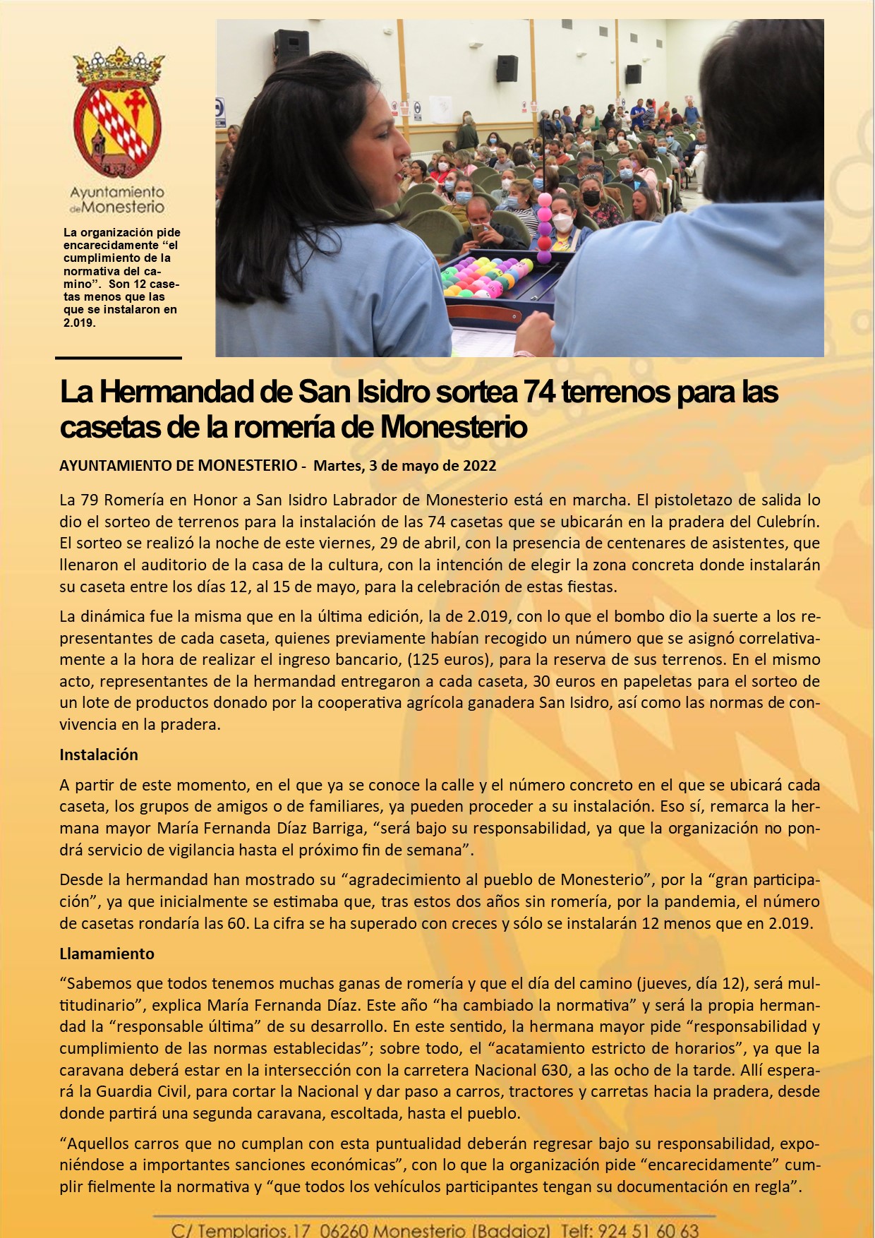 La Hermandad de San Isidro sortea 74 terrenos para las casetas de la romería de Monesterio