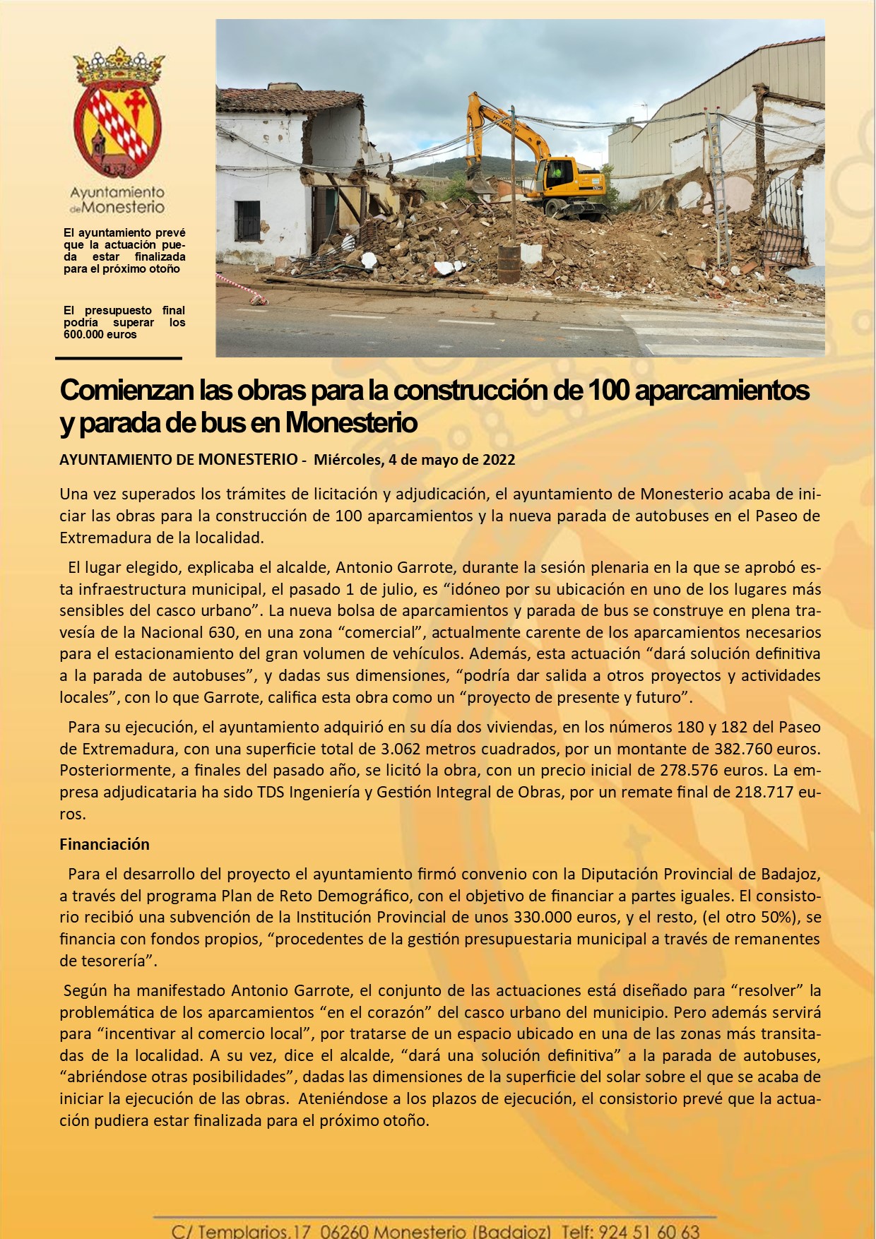 Comienzan las obras para la construcción de 100 aparcamientos y parada de bus en Monesterio