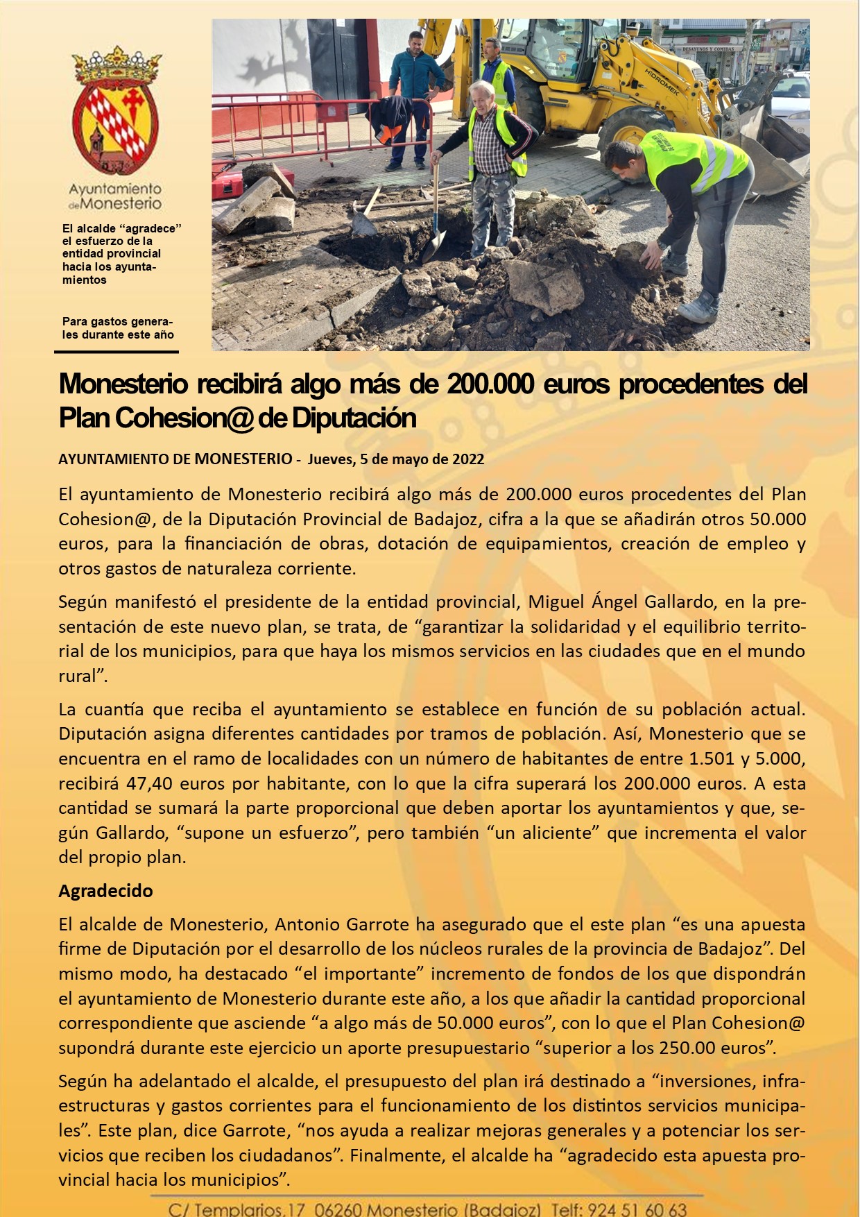 Monesterio recibirá algo más de 200.000 euros procedentes del Plan Cohesion@ de Diputación