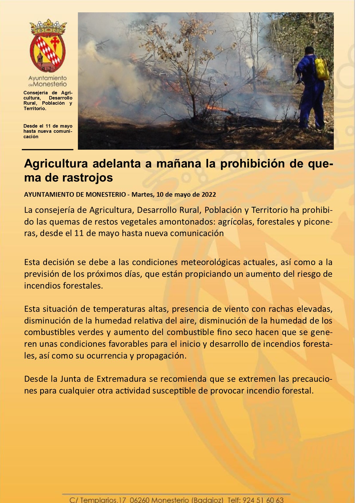 Agricultura adelanta a mañana la prohibición de quema de rastrojos