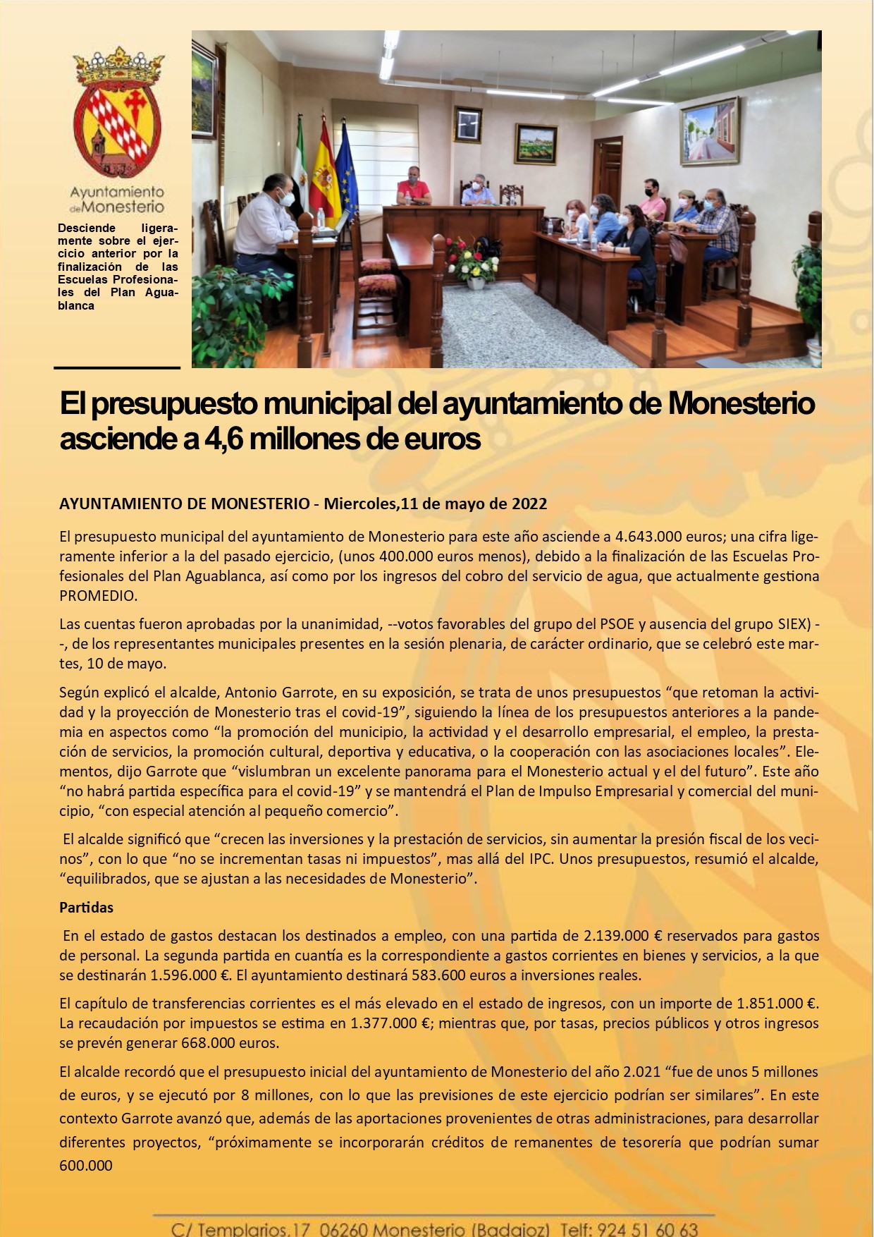 El presupuesto municipal del ayuntamiento de Monesterio asciende a 4,6 millones de euros