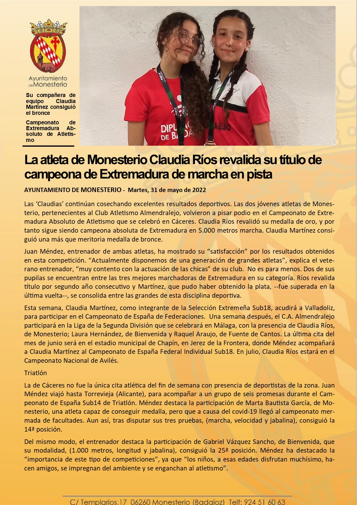 La atleta de Monesterio Claudia Ríos revalida su título de campeona de Extremadura de marcha en pista