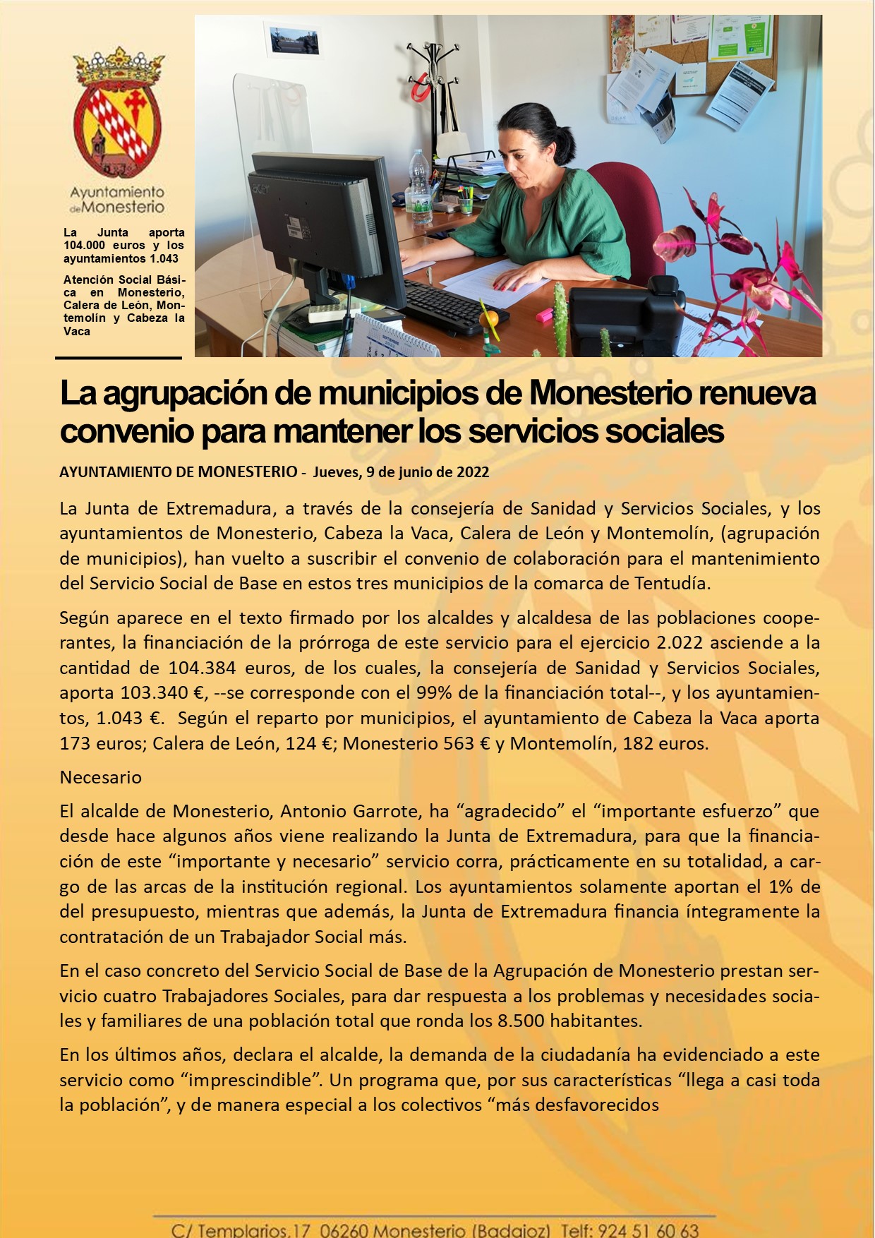 La agrupación de municipios de Monesterio renueva convenio para mantener los servicios sociales