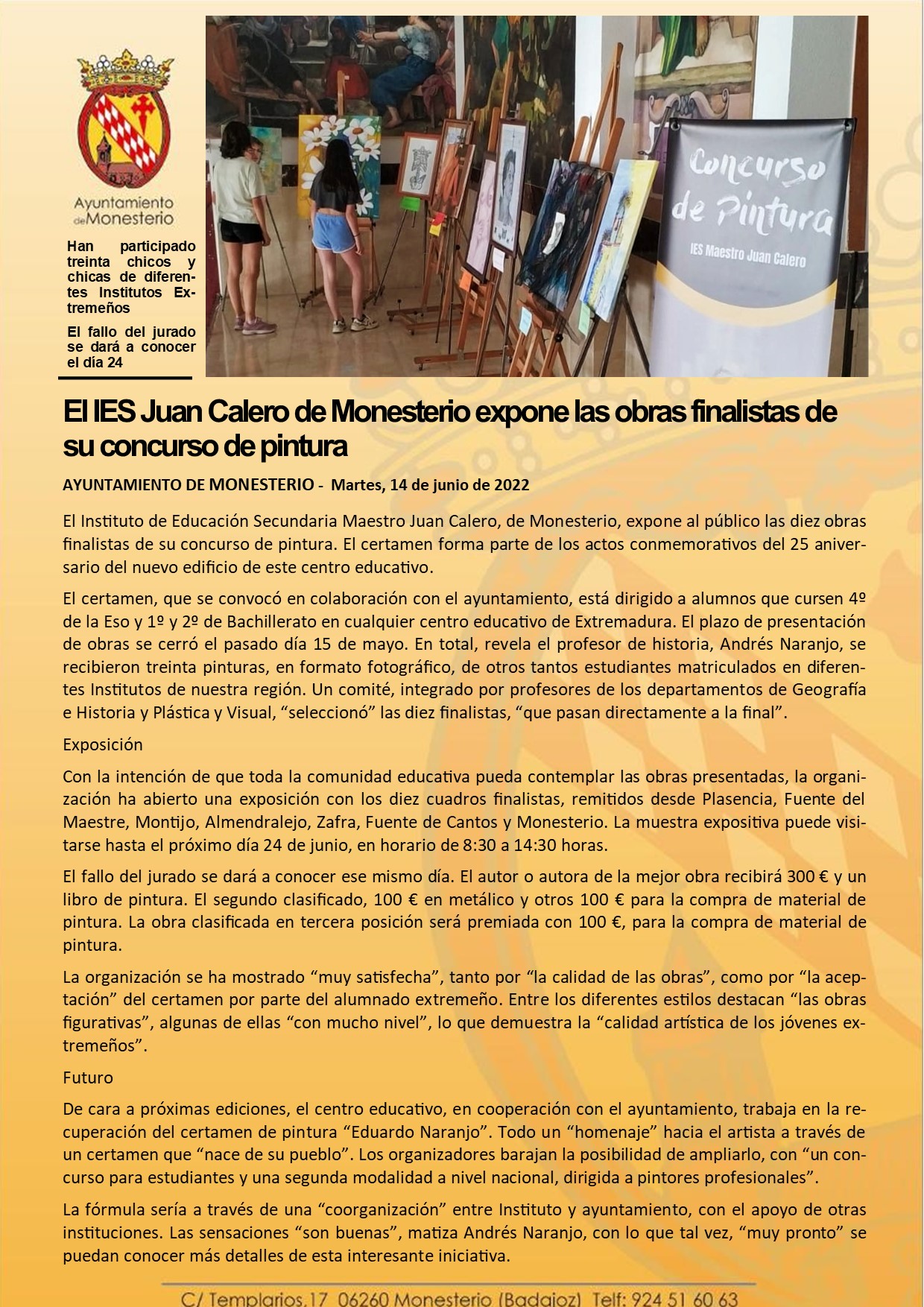 El IES Juan Calero de Monesterio expone las obras finalistas de su concurso de pintura