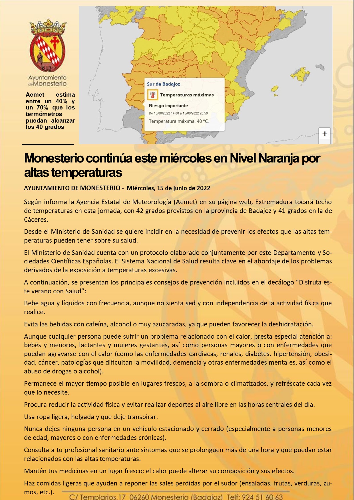 Monesterio continúa este miércoles en Nivel Naranja por altas temperaturas