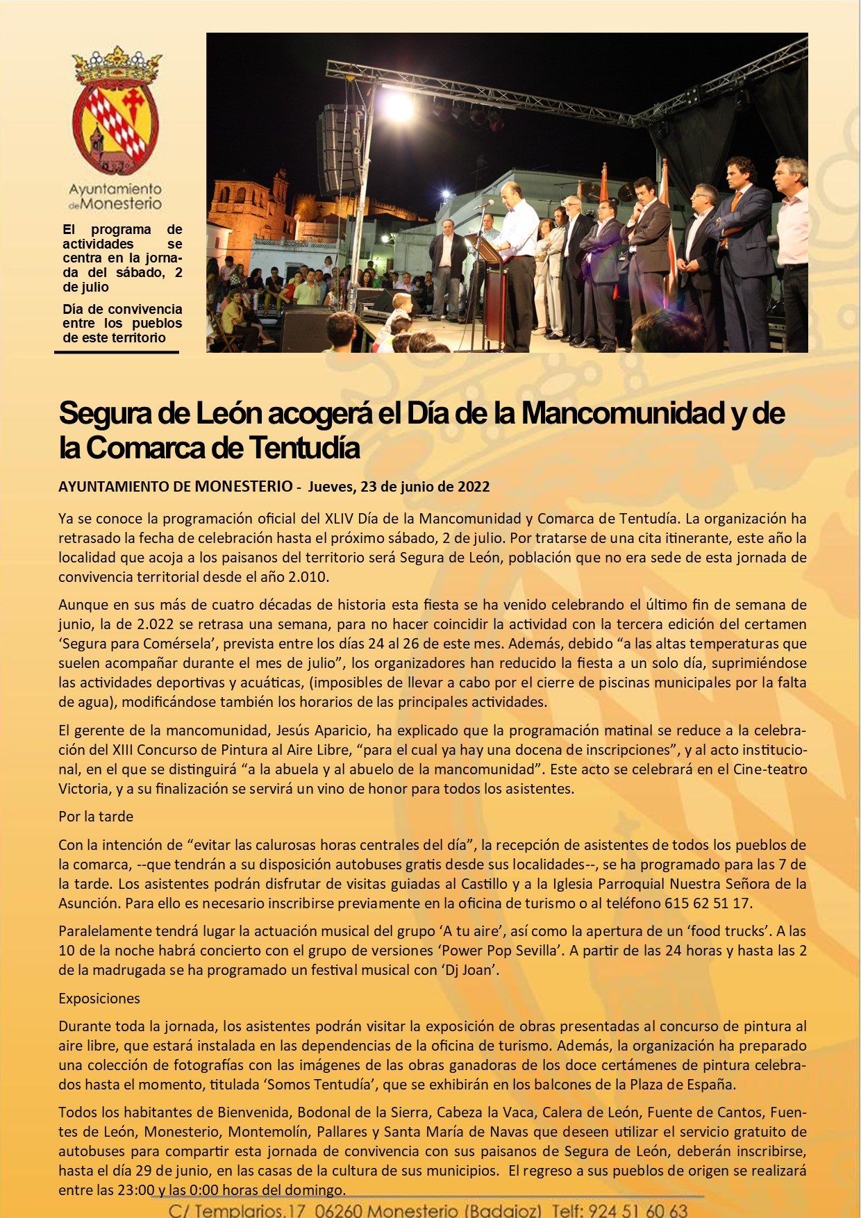 Segura de León acogerá el Día de la Mancomunidad y de la Comarca de Tentudía