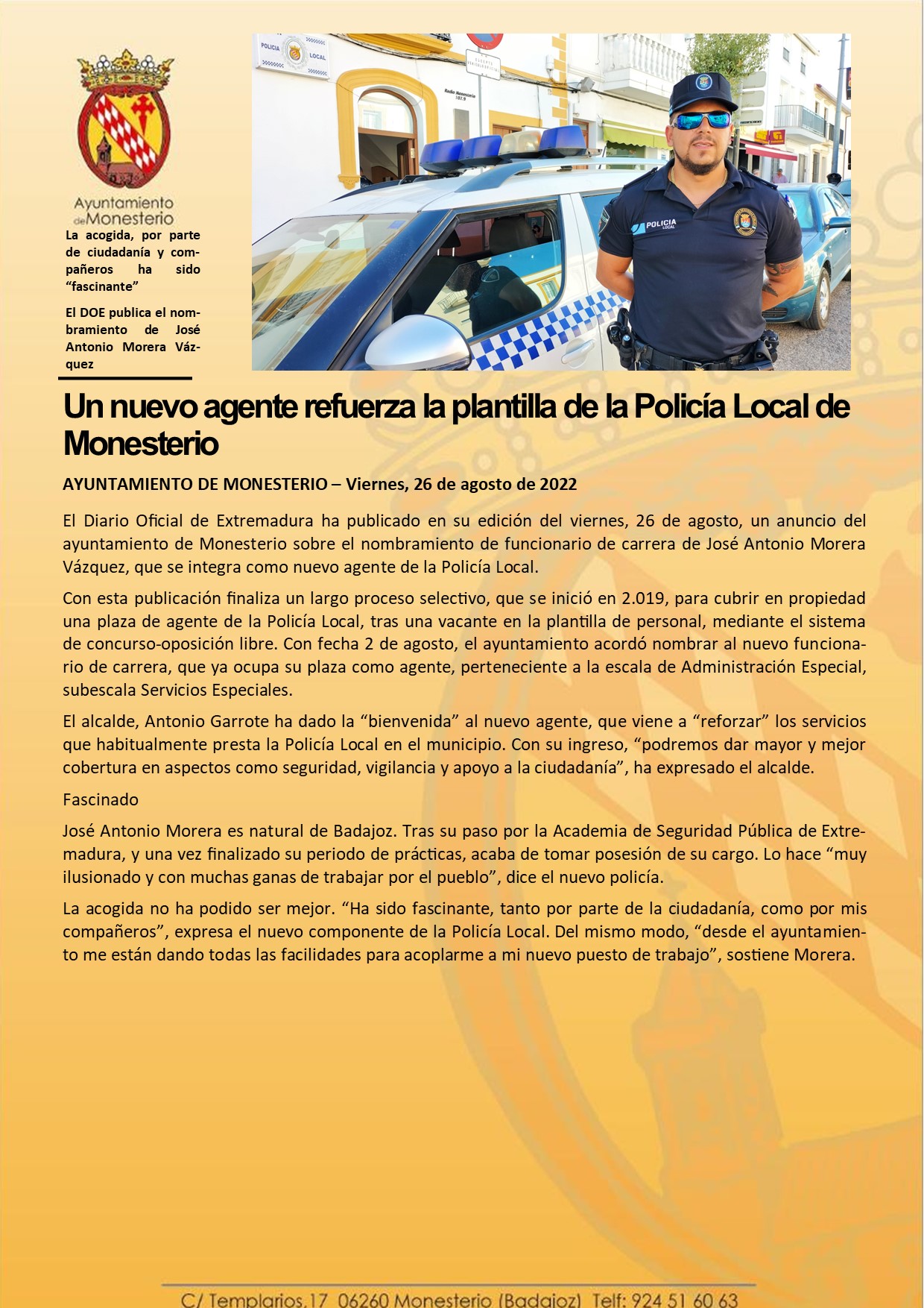 Un nuevo agente refuerza la plantilla de la Policía Local de Monesterio