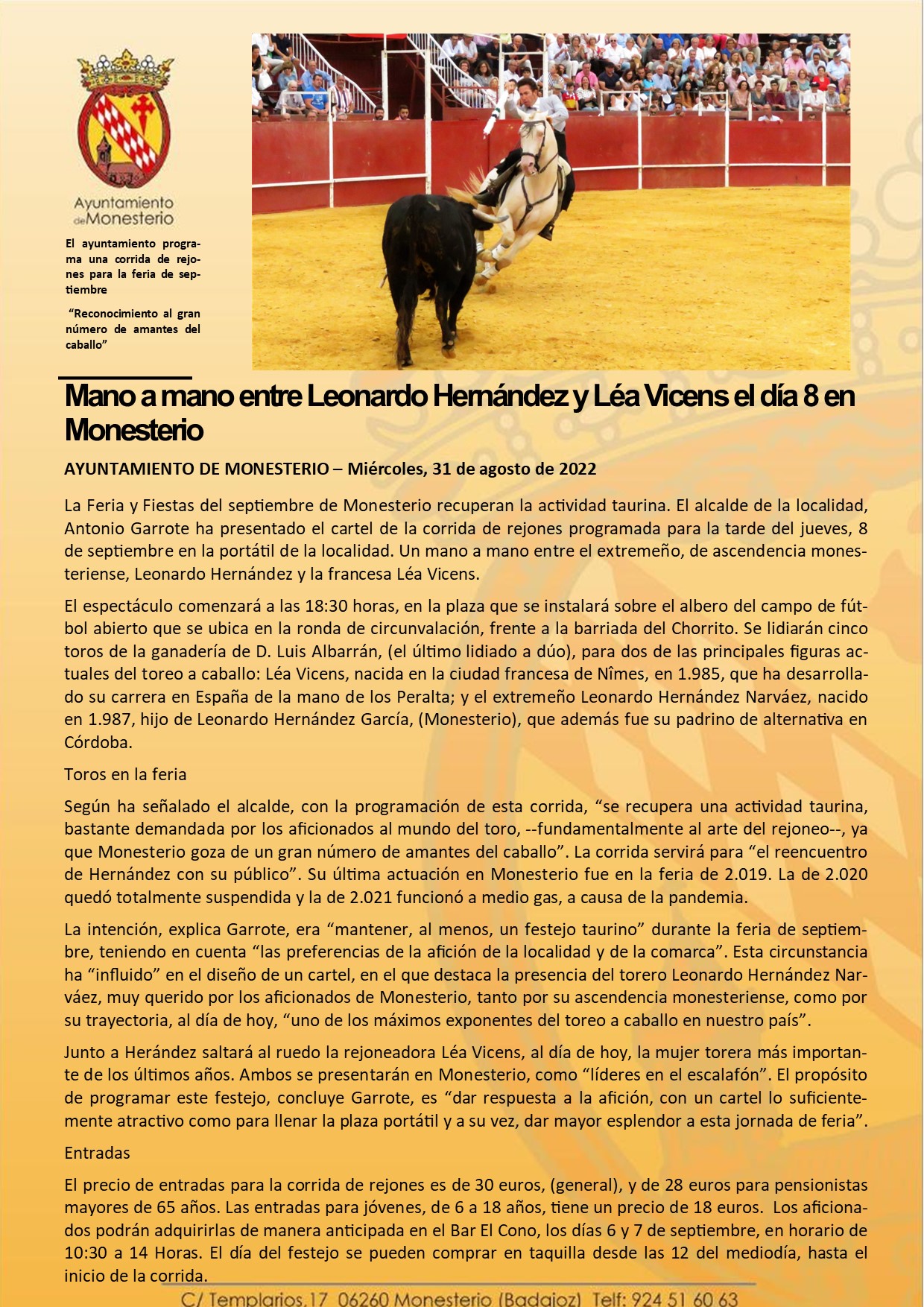 Mano a mano entre Leonardo Hernández y Léa Vicens el día 8 en Monesterio