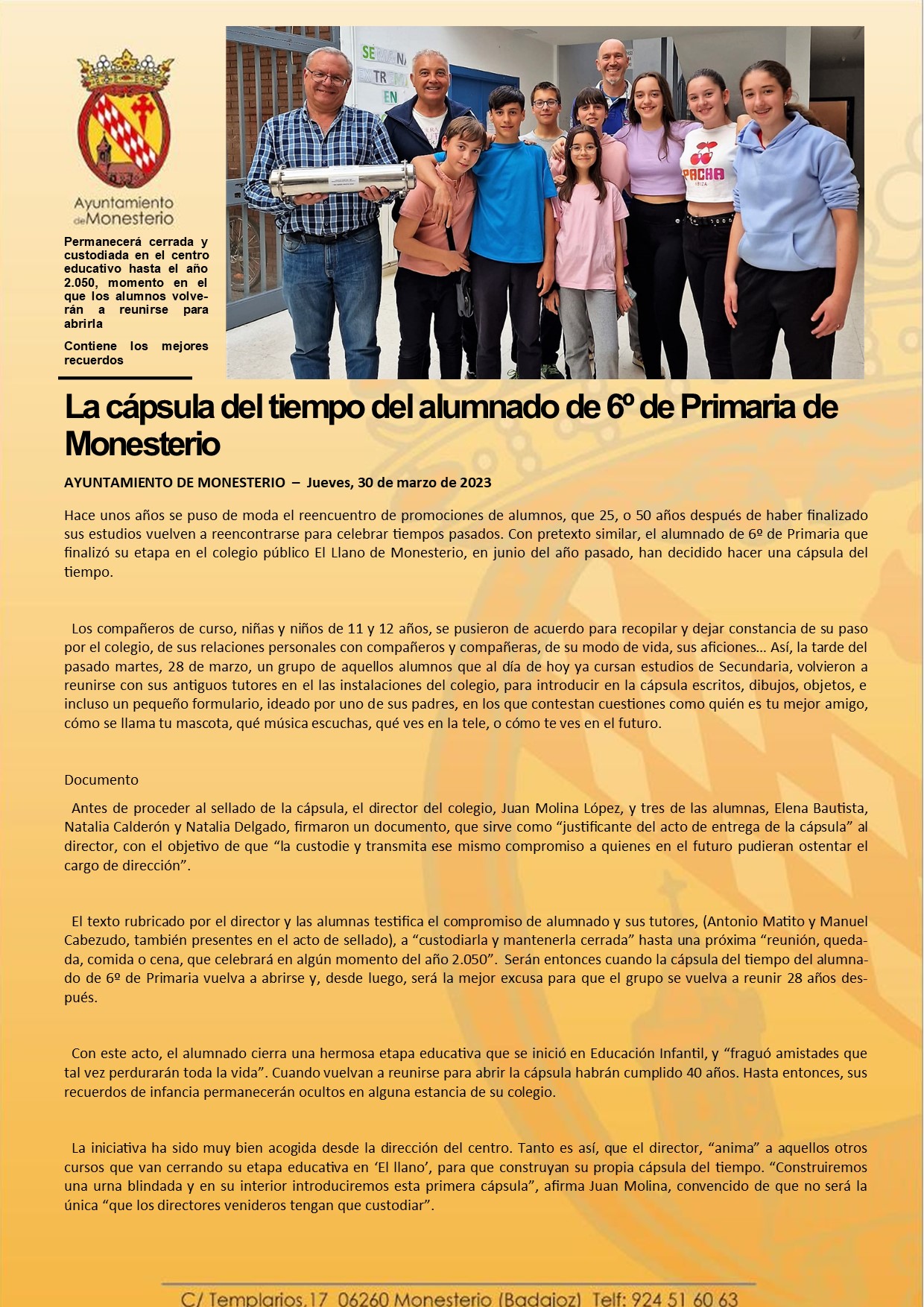 La cápsula del tiempo del alumnado de 6º de Primaria de Monesterio