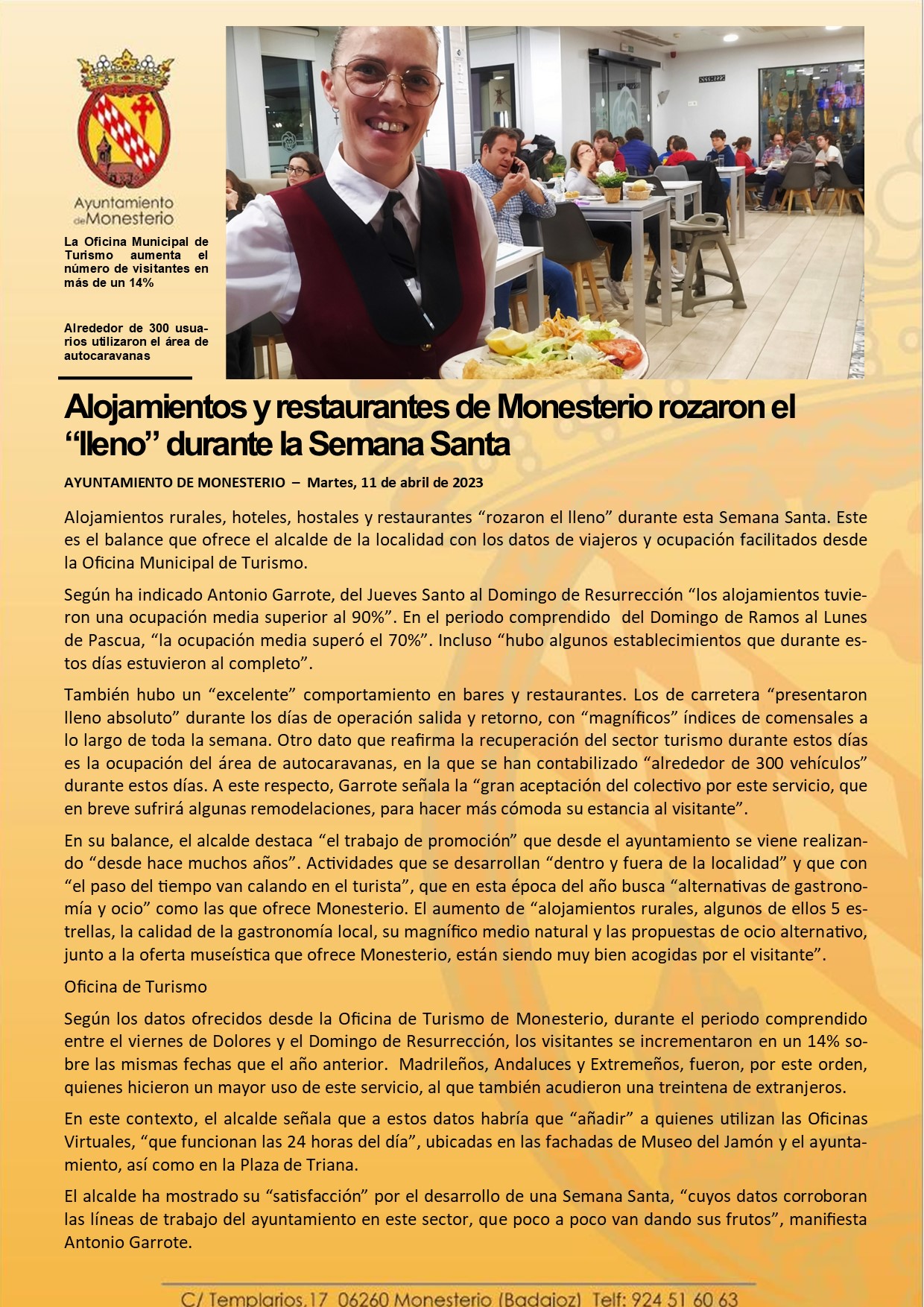 Alojamientos y restaurantes de Monesterio rozaron el “lleno” durante la Semana Santa