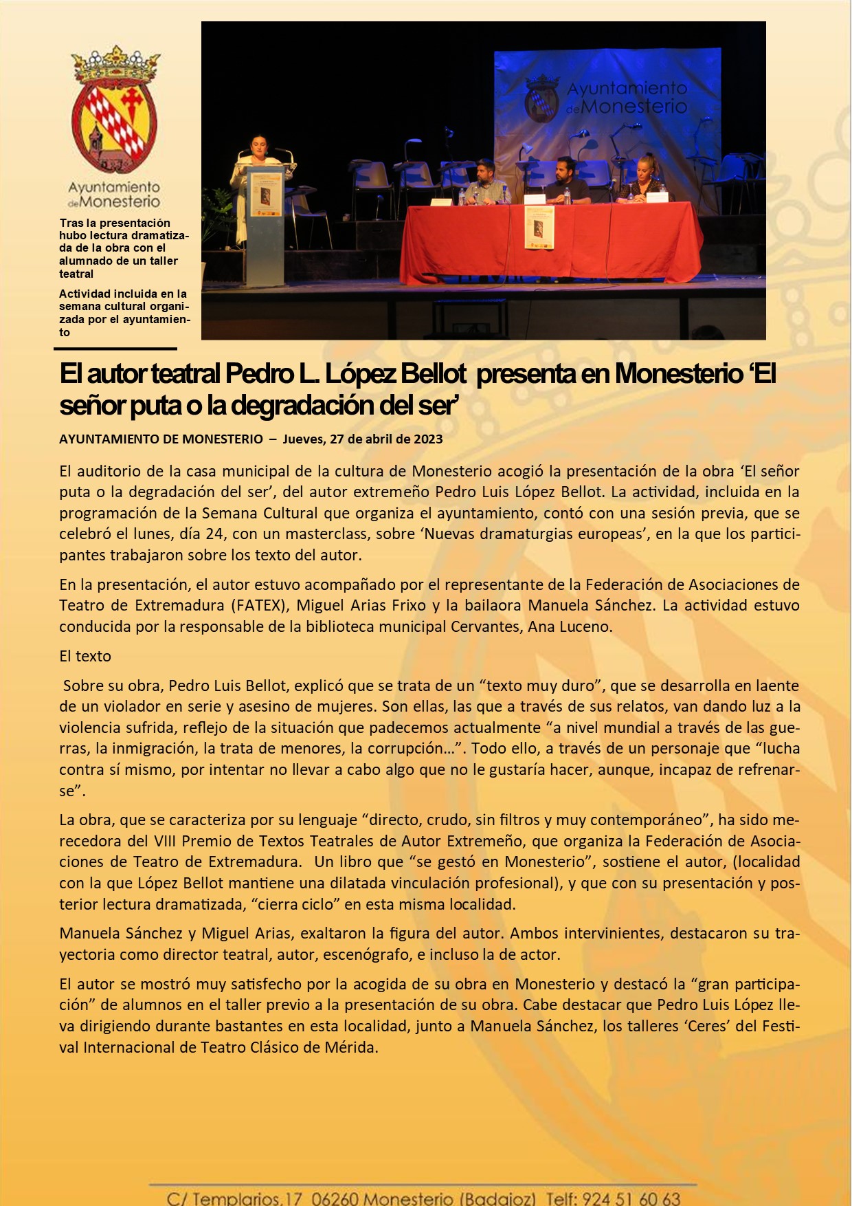 El autor teatral Pedro L. López Bellot presenta en Monesterio ‘El señor puta o la degradación del ser’