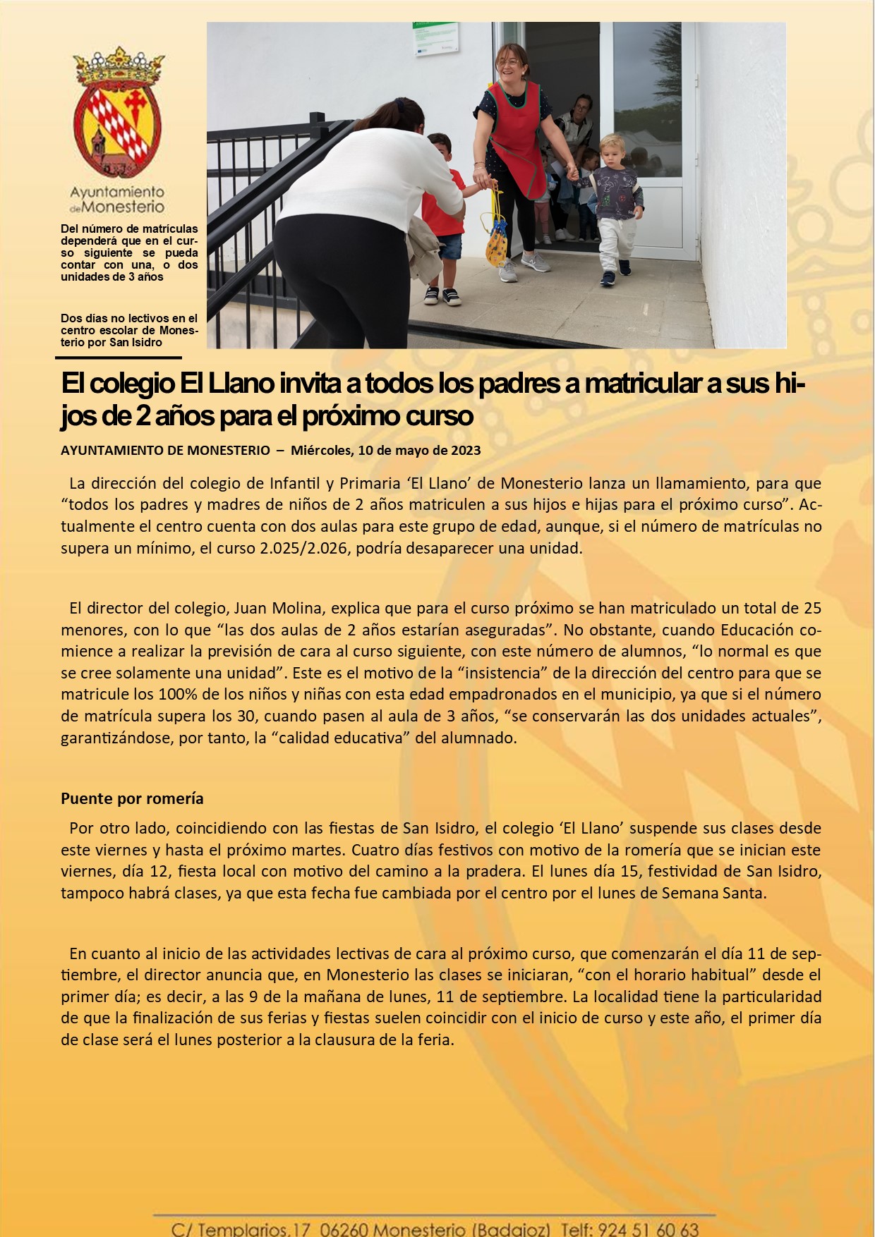El colegio El Llano invita a todos los padres a matricular a sus hijos de 2 años para el próximo curso