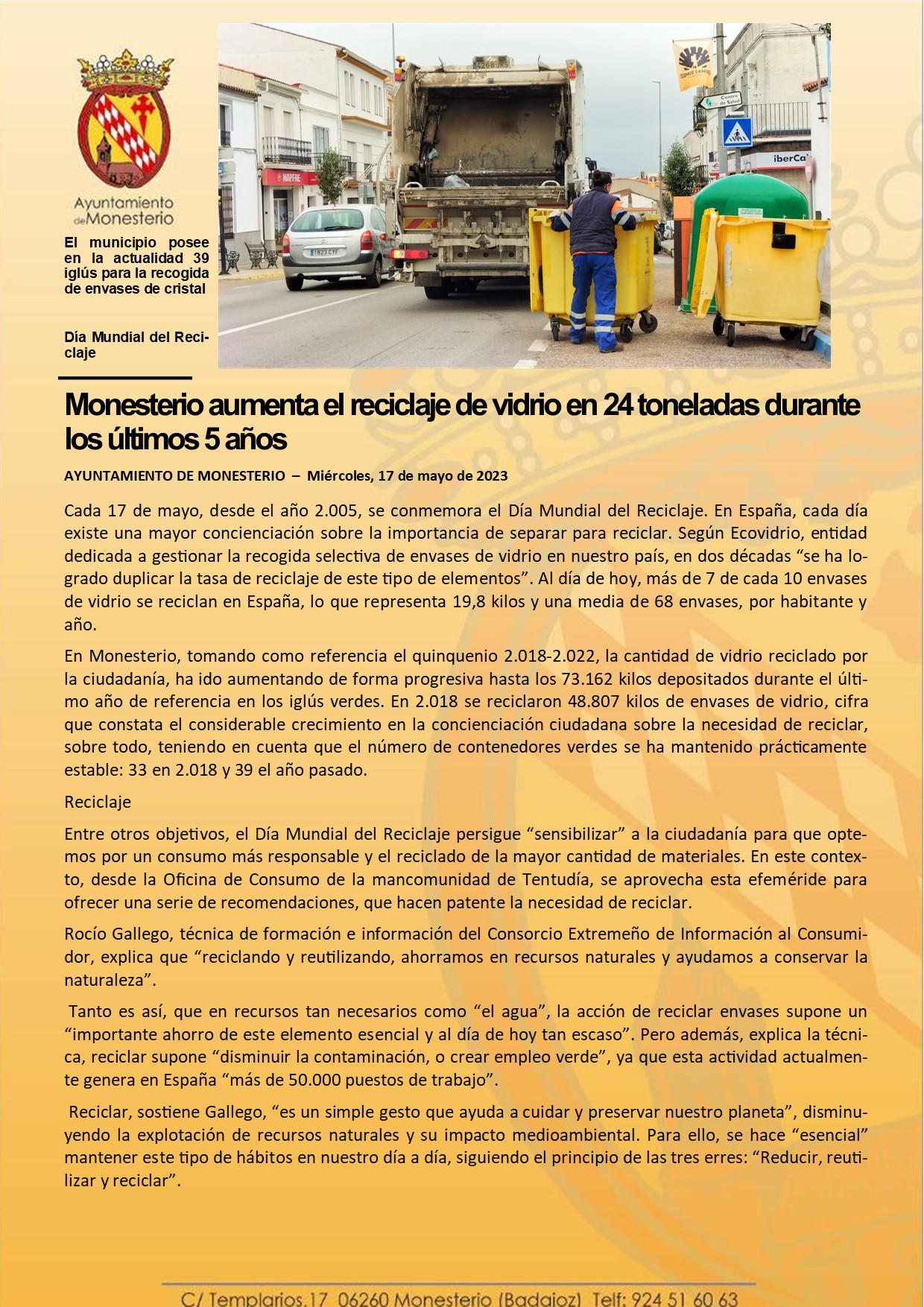 Monesterio aumenta el reciclaje de vidrio en 24 toneladas durante los últimos 5 años