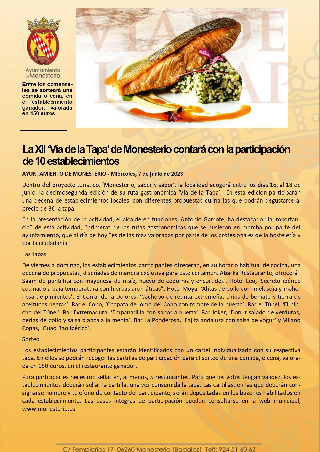 La XII ‘Vía de la Tapa’ de Monesterio contará con la participación de 10 establecimientos