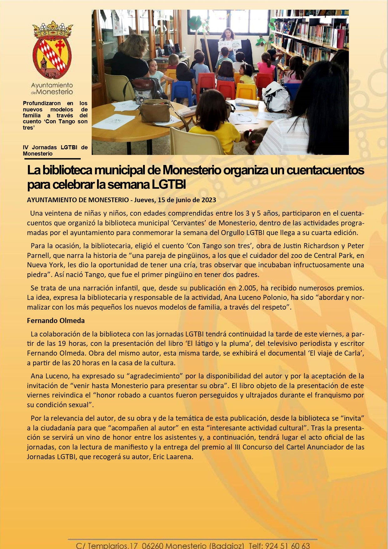 La biblioteca municipal de Monesterio organiza un cuentacuentos para celebrar la semana LGTBI