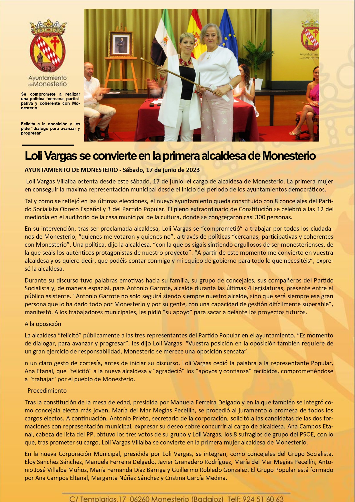 Loli Vargas se convierte en la primera alcaldesa de Monesterio