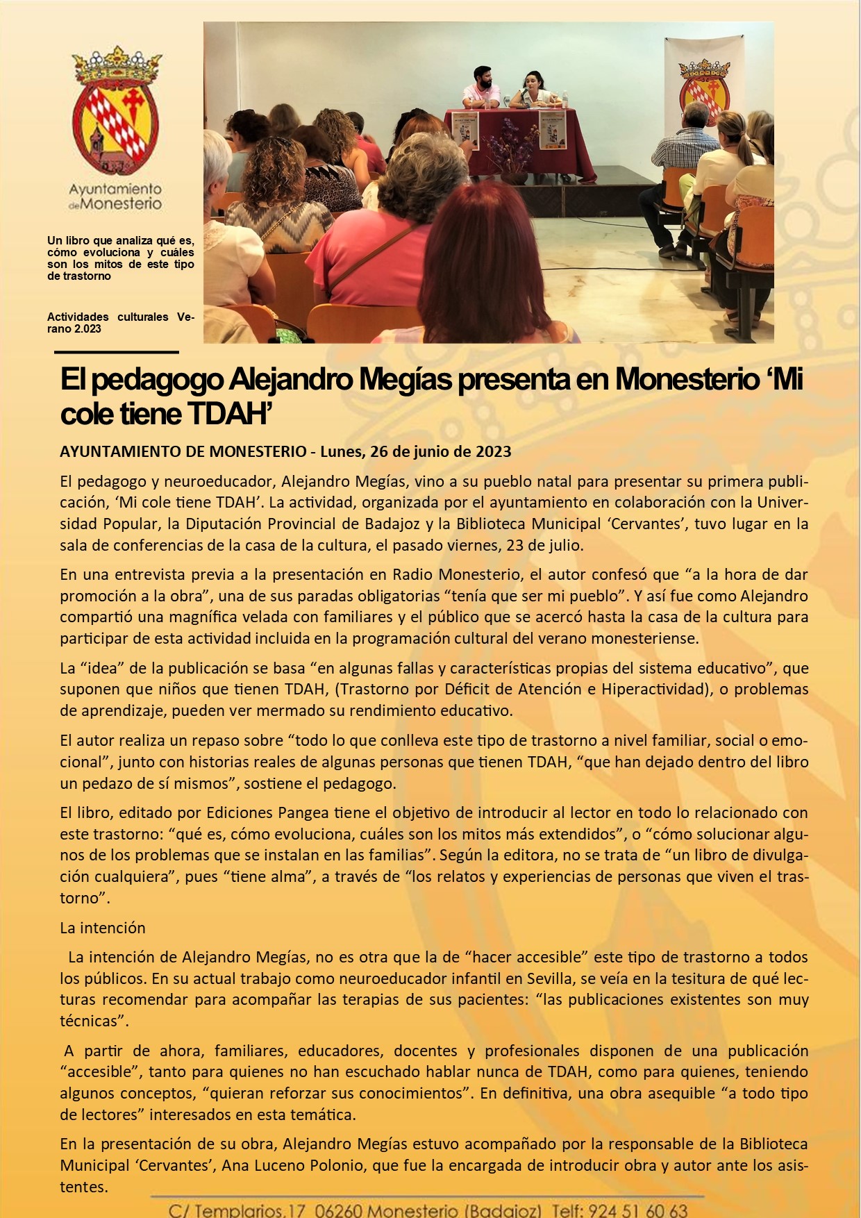 El pedagogo Alejandro Megías presenta en Monesterio ‘Mi cole tiene TDAH’