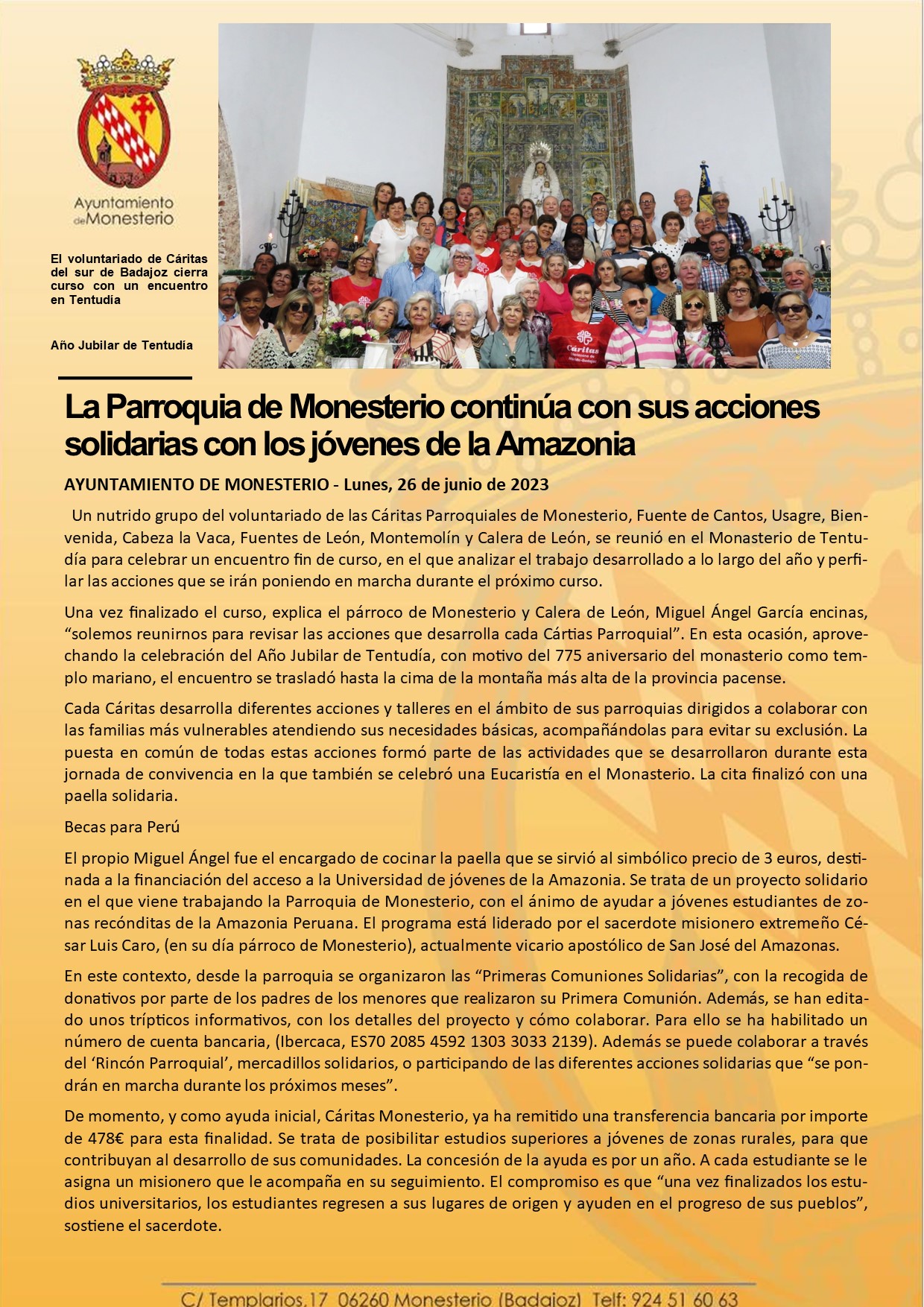 La Parroquia de Monesterio continúa con sus acciones solidarias con los jóvenes de la Amazonia