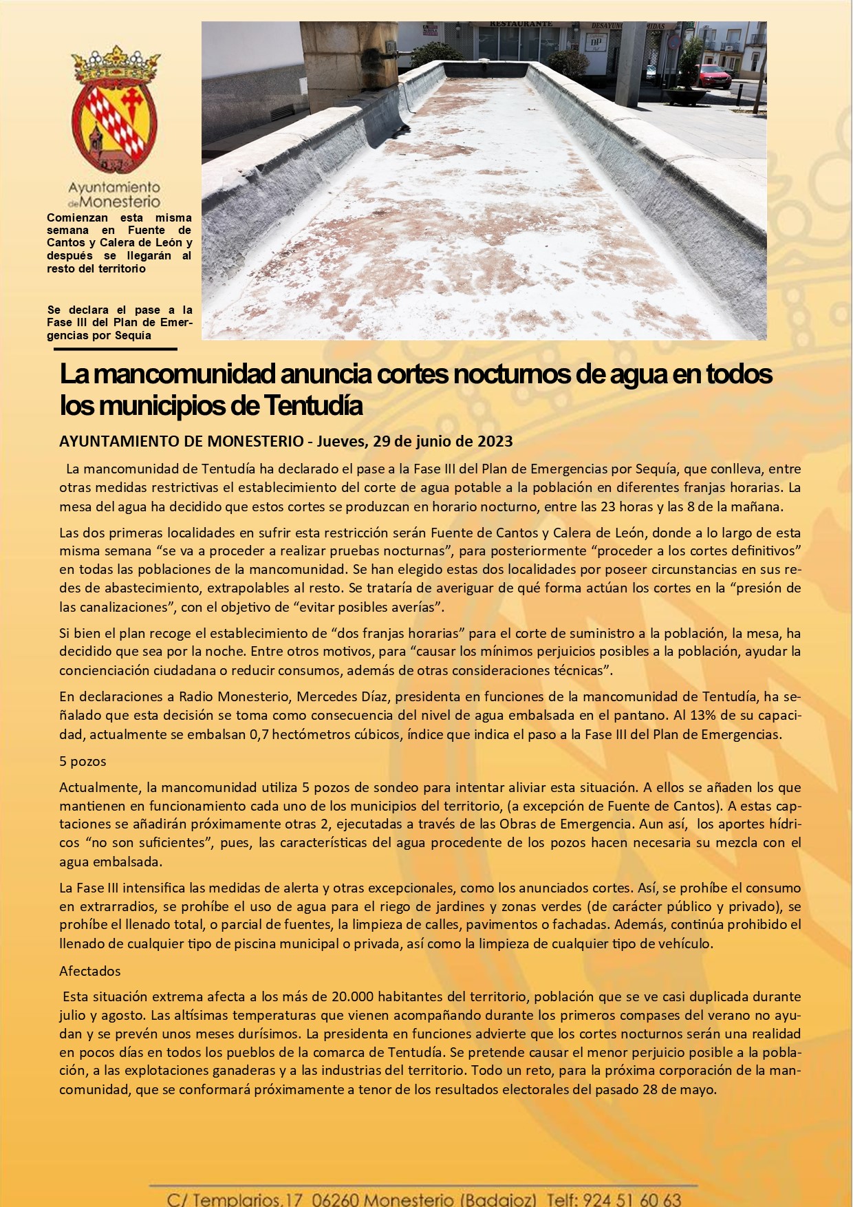La mancomunidad anuncia cortes nocturnos de agua en todos los municipios de Tentudía