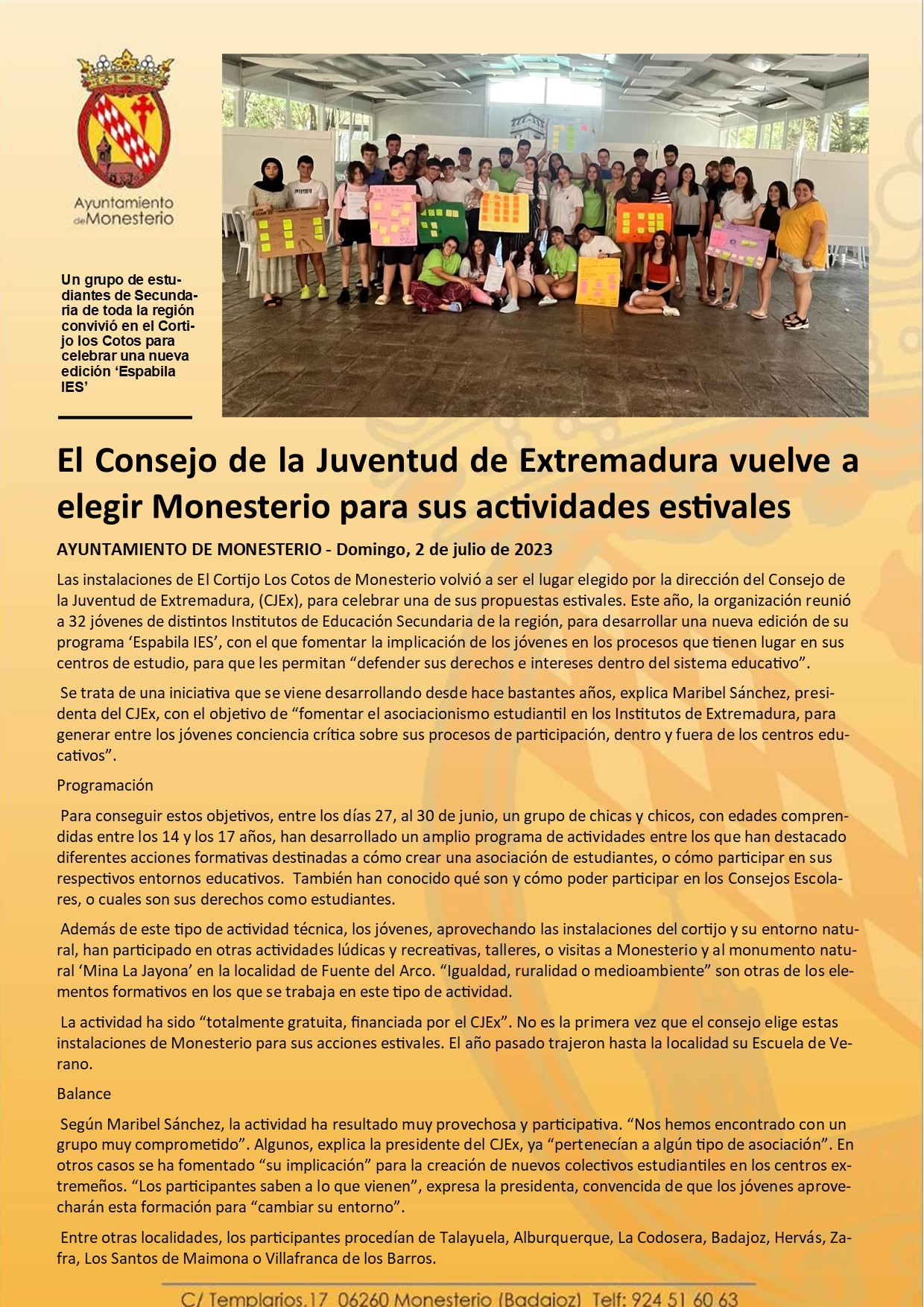 El Consejo de la Juventud de Extremadura vuelve a elegir Monesterio para sus actividades estivales