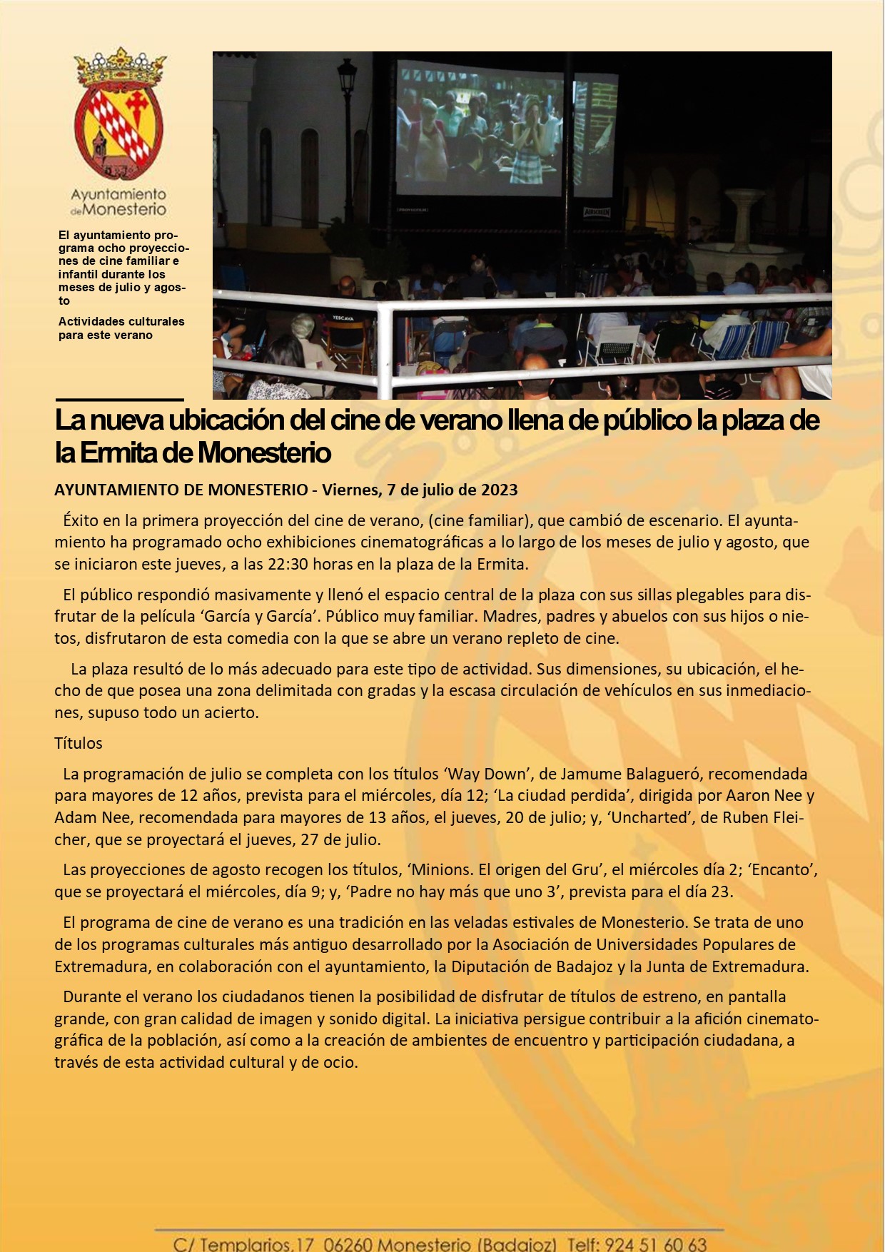 La nueva ubicación del cine de verano llena de público la plaza de la Ermita de Monesterio
