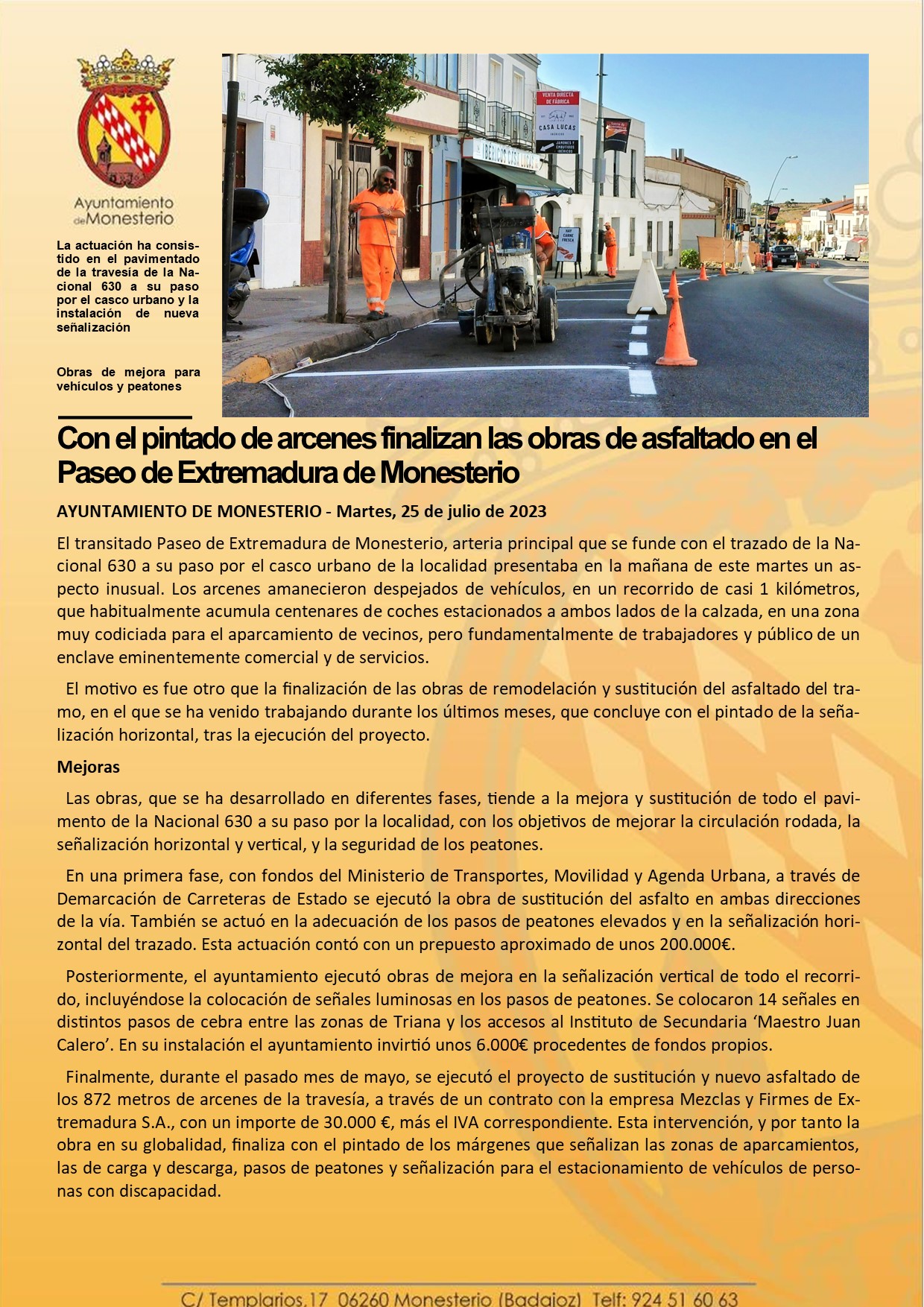 Con el pintado de arcenes finalizan las obras de asfaltado en el Paseo de Extremadura de Monesterio