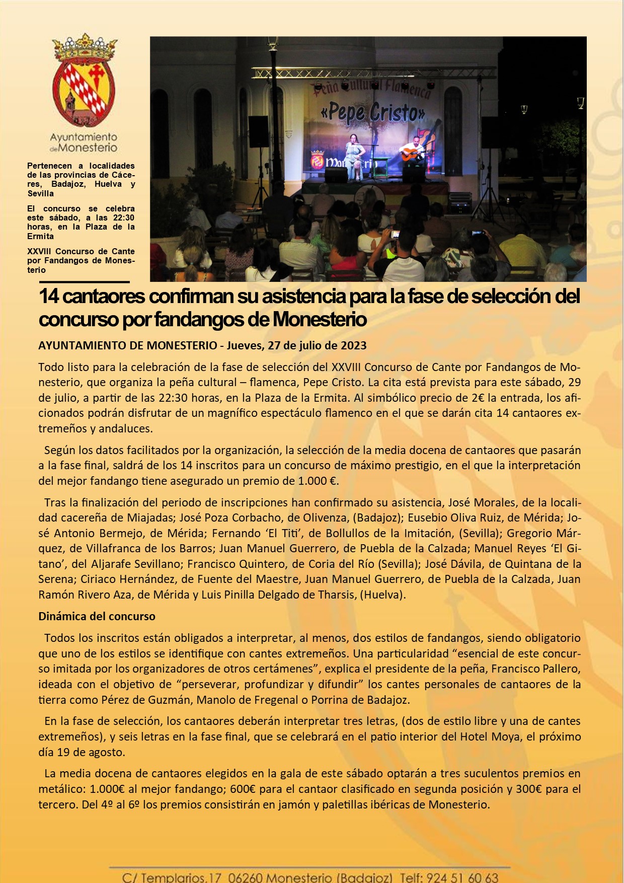 14 cantaores confirman su asistencia para la fase de selección del concurso por fandangos de Monesterio