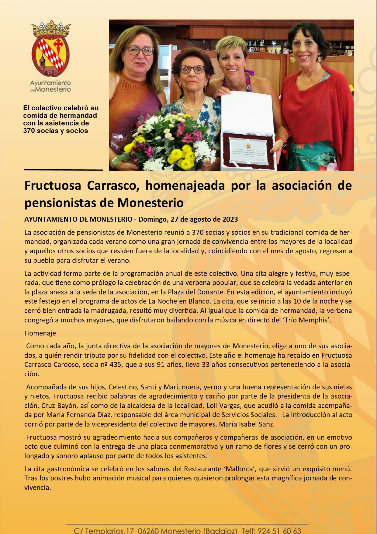 Fructuosa Carrasco, homenajeada por la asociación de pensionistas de Monesterio