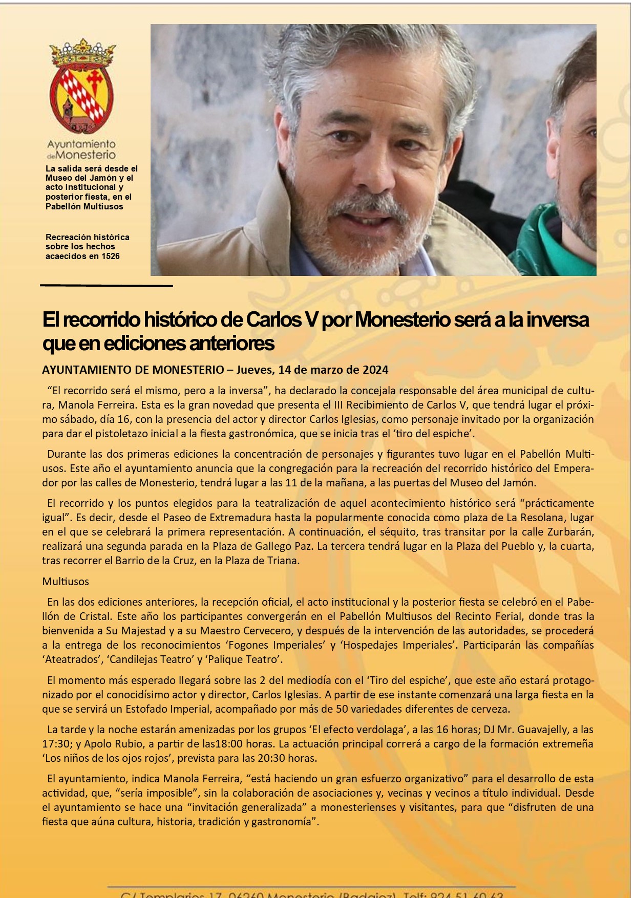 El recorrido histórico de Carlos V por Monesterio será a la inversa que en ediciones anteriores