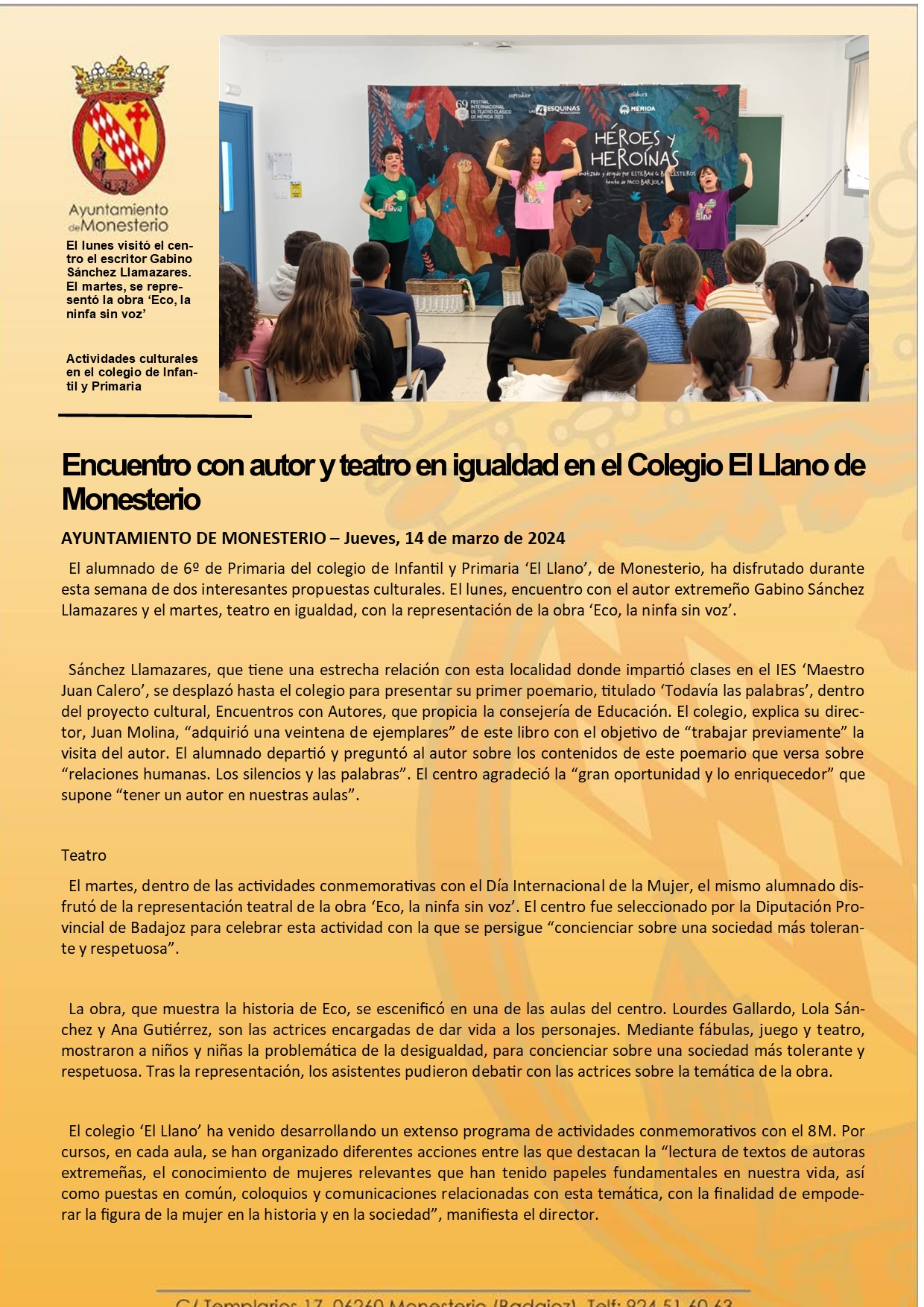 Encuentro con autor y teatro en igualdad en el Colegio El Llano de Monesterio